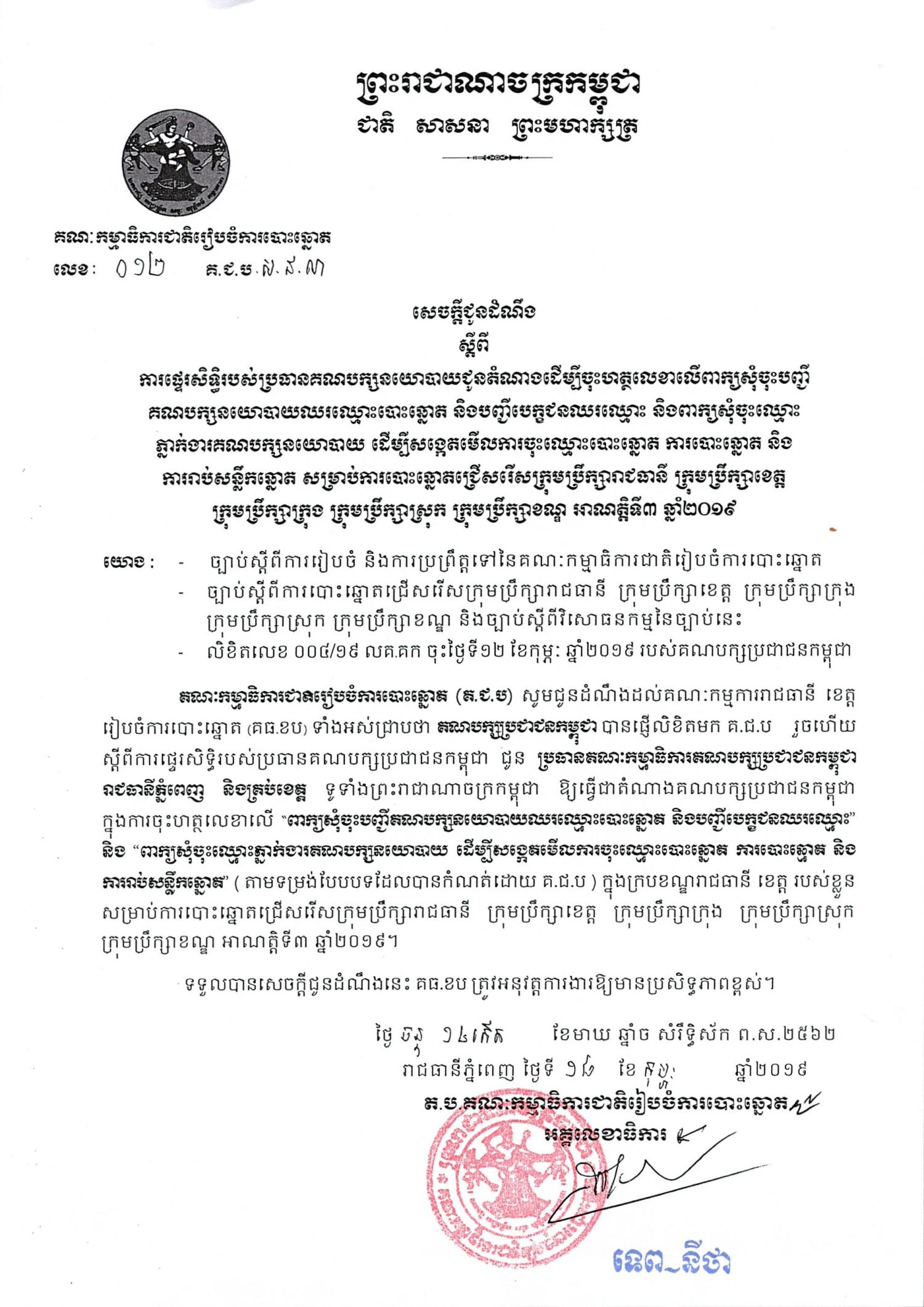 សេចក្ដីជូនដំណឹង លេខ ០១២ ស្ដីពីការផ្ទេរសិទ្ធិប្រធានគណបក្សនយោបាយជូនតំណាងដើម្បីចុះហត្ថលេខាលើពាក្យសុំចុះបញ្ជីគណបក្សនយោបាយឈរឈ្មោះបោះឆ្នោត និងបញ្ជីបេក្ខជនឈរឈ្មោះ និងពាក្យសុំចុះឈ្មោះភ្នាក់ងារគណបក្សនយោបាយ(គណបក្សប្រជាជន)