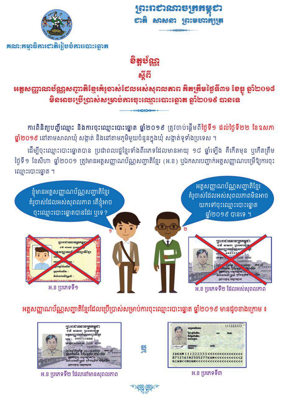 ខិត្តប័ណ្ណ ស្តីពីអត្តសញ្ញាណប័ណ្ណសញ្ជាតិខ្មែរគំរូចាស់ដែលអស់សុពលភាព គិតត្រឹមថ្ងៃទី៣១ ខែធ្នូ ឆ្នាំ២០១៨ មិនអាចប្រើប្រាស់សម្រាប់ការចុះឈ្មោះបោះឆ្នោត ឆ្នាំ២០១៩ បានទេ!