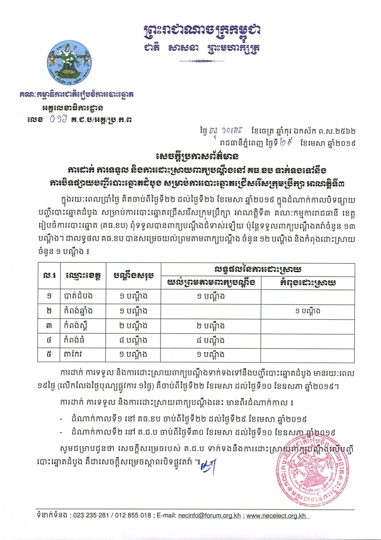 សេចក្ដីប្រកាសព័ត៌មាន លេខ ០១៦៖ ការដាក់ ការទទួល និងការដោះស្រាយពាក្យបណ្ដឹងនៅ គធ.ខប ទាក់ទងនៅនឹងការបិទផ្សាយបញ្ជីបោះឆ្នោត សម្រាប់ការបោះឆ្នោតជ្រើសរើសក្រុមប្រឹក្សា អាណត្តិទី៣