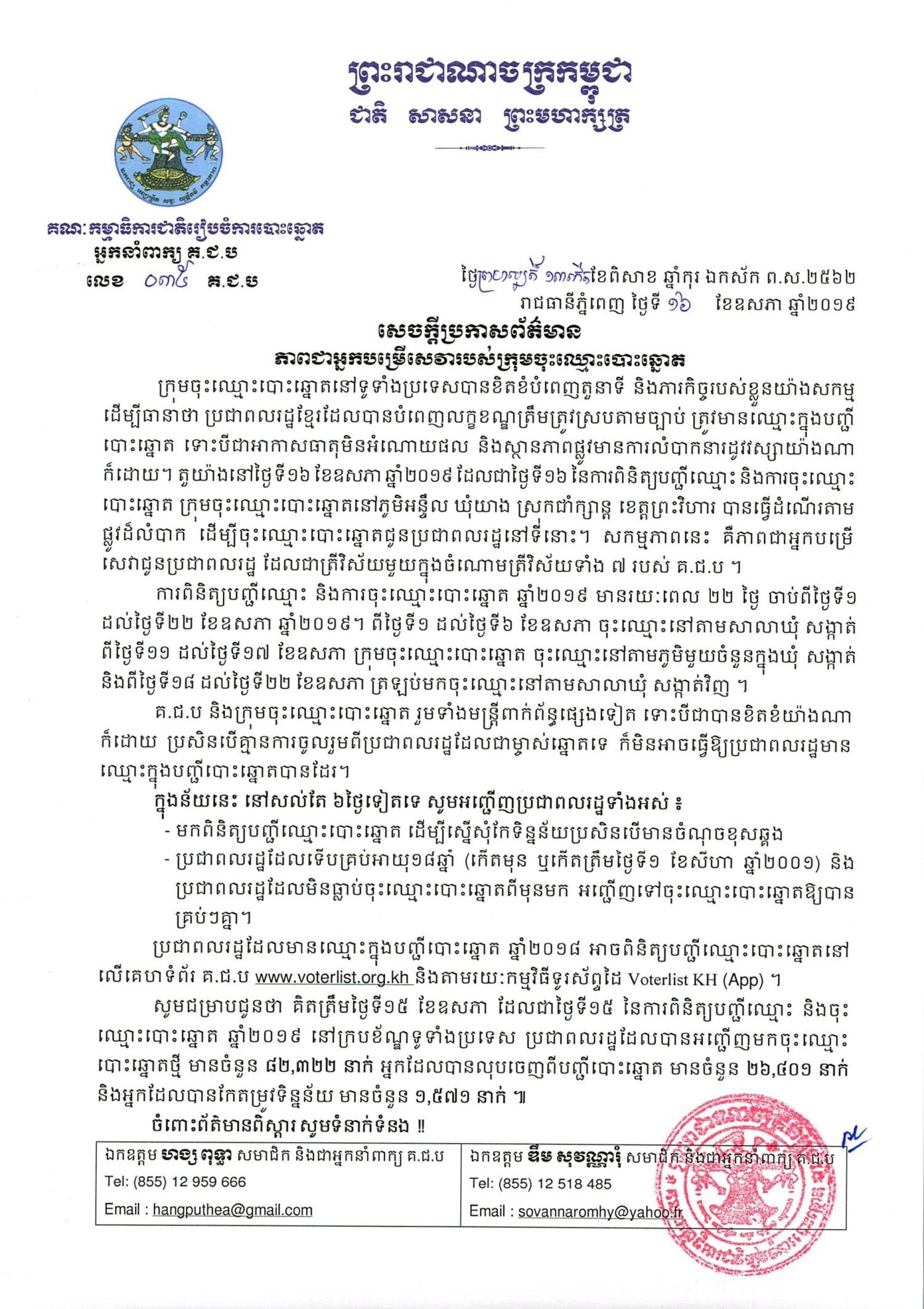 សូមជម្រាបជូនថា គិតត្រឹមថ្ងៃទី១៥ ខែឧសភា ដែលជាថ្ងៃទី១៥ នៃការពិនិត្យបញ្ជីឈ្មោះ និងចុះឈ្មោះបោះឆ្នោត ឆ្នាំ២០១៩ នៅក្របខ័ណ្ឌទូទាំងប្រទេស ប្រជាពលរដ្ឋដែលបានអញ្ជើញមកចុះឈ្មោះបោះឆ្នោតថ្មី មានចំនួន ៨២,៣២២ នាក់ អ្នកដែលបានលុបចេញពីបញ្ជីបោះឆ្នោត មានចំនួន ២៦,៤០១ នាក់ និងអ្នកដែលបានកែតម្រូវទិន្នន័យ មានចំនួន ១,៥៧១ នាក់ ៕