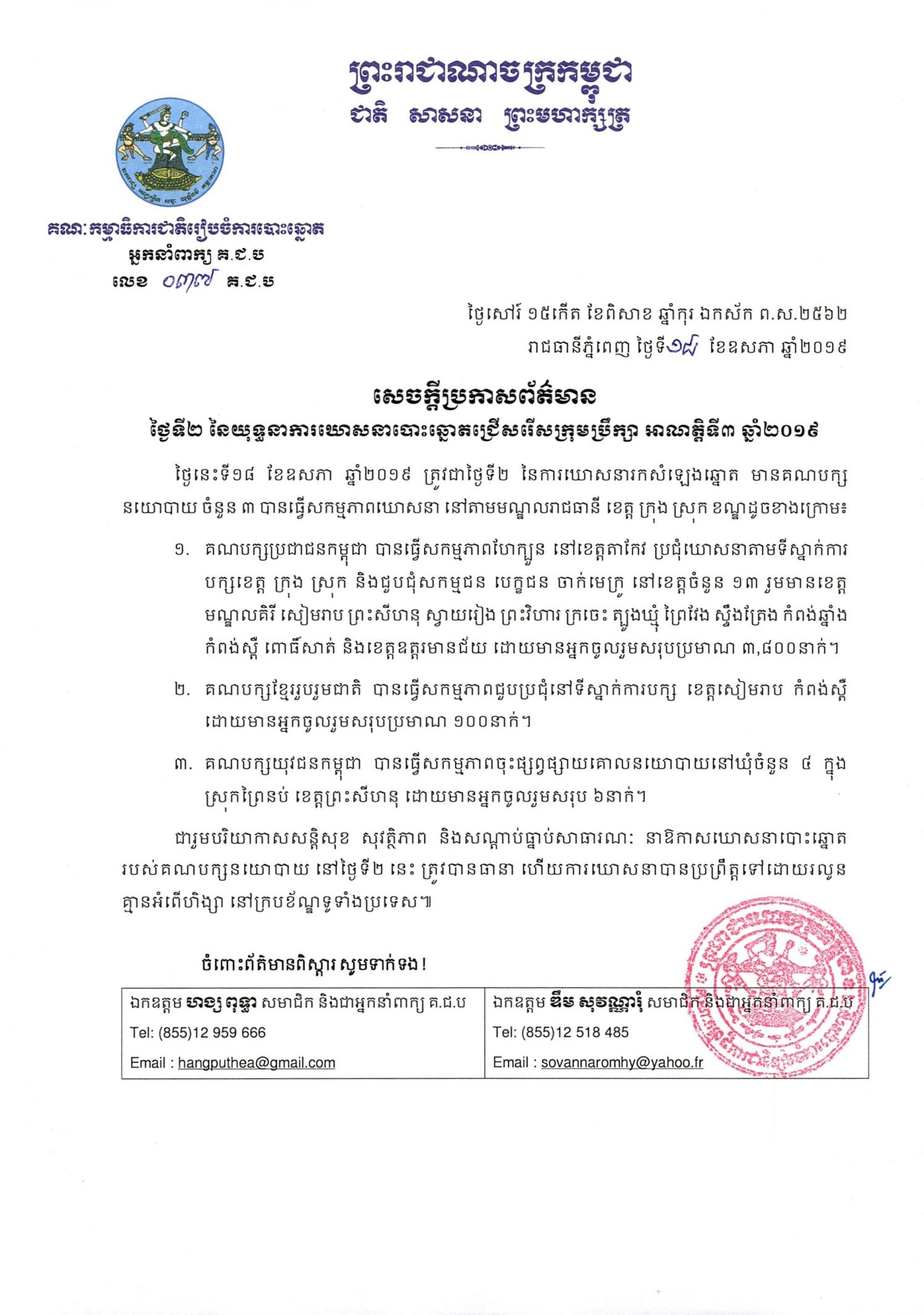 ថ្ងៃនេះទី១៨ ខែឧសភា ឆ្នាំ២០១៩ ត្រូវជាថ្ងៃទី២ នៃការឃោសនារកសំឡេងឆ្នោត មានគណបក្សនយោបាយ ចំនួន ៣ បានធ្វើសកម្មភាពឃោសនា នៅតាមមណ្ឌលរាជធានី ខេត្ត ក្រុង ស្រុក ខណ្ឌដូចខាងក្រោម៖