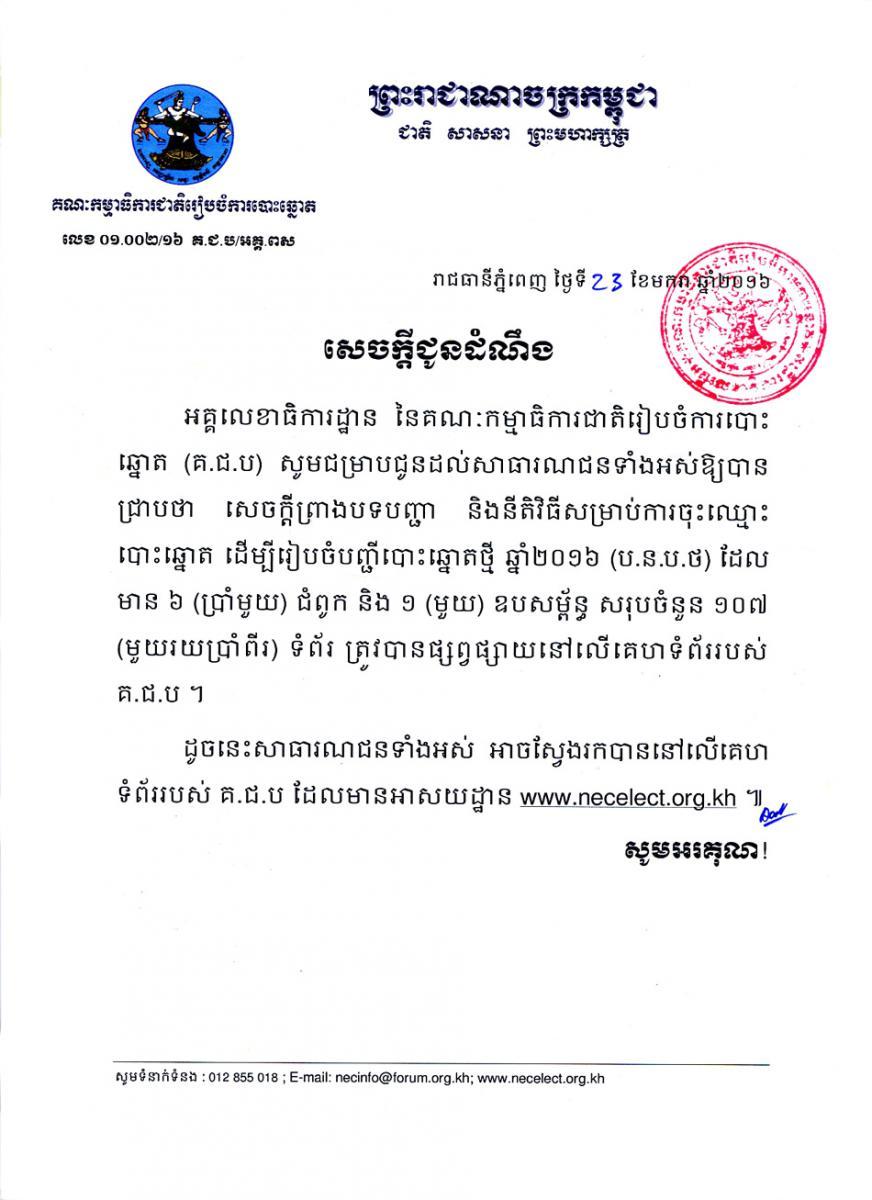 សេចក្តីជូនដំណឹង ៖ សេចក្តីព្រាងបទបញ្ជា និងនីតិវិធីសម្រាប់ការចុះឈ្មោះបោះឆ្នោត ដើម្បីរៀបចំបញ្ជីបោះឆ្នោតថ្មីឆ្នាំ២០១៦ ត្រូវបានផ្សព្វផ្សាយនៅលើគេហទំព័រ គ.ជ.ប