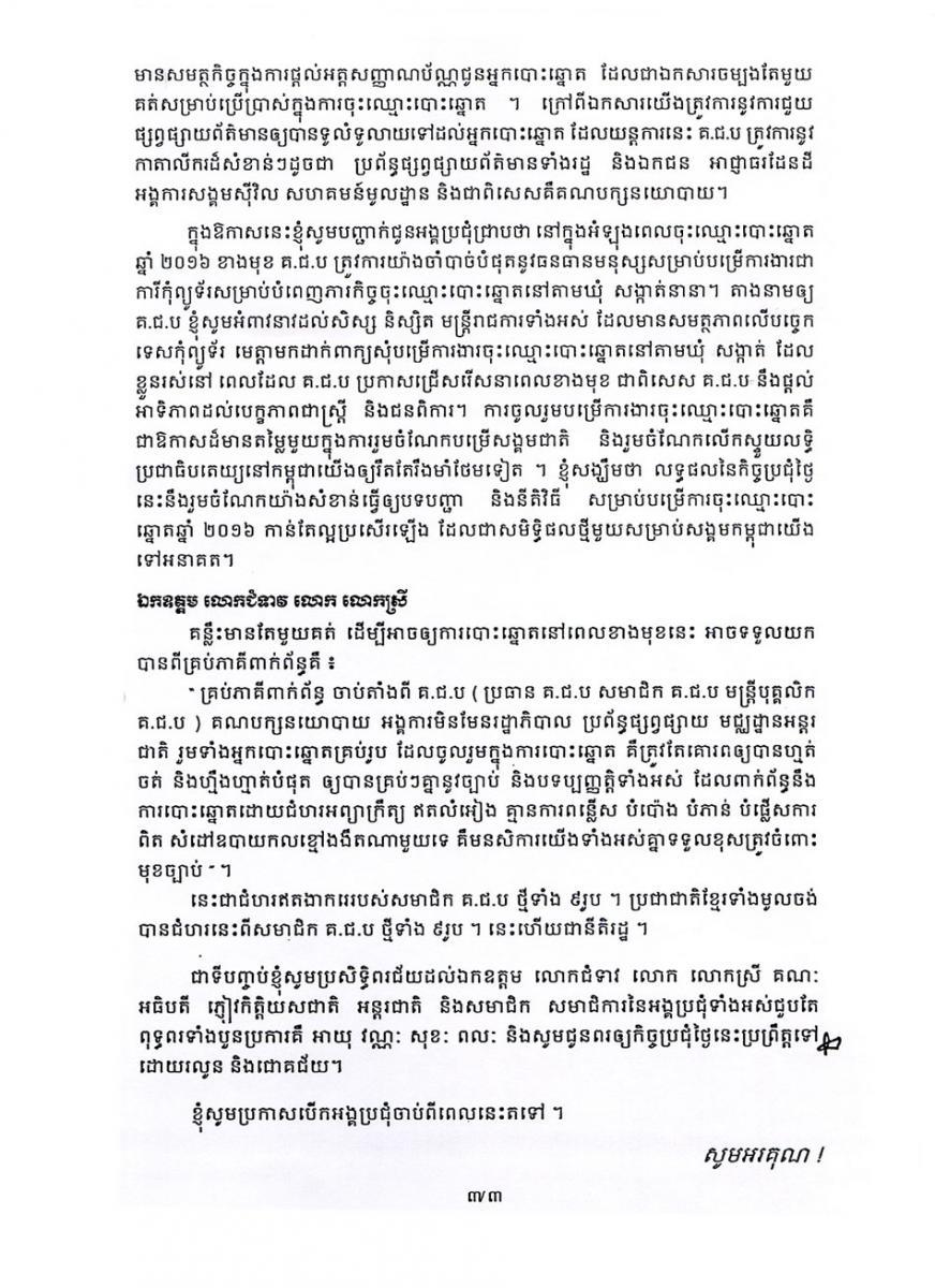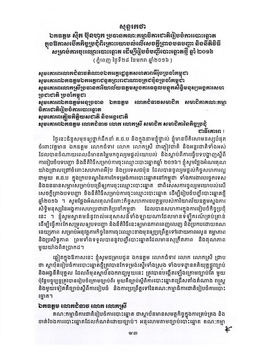 សុន្ទរកថា៖ ឯកឧត្តម ស៊ិក ប៊ុនហុក ប្រធានគណៈកម្មាធិការជាតិរៀបចំការបោះឆ្នោត ក្នុងឱកាសបើកកិច្ចប្រជុំពិគ្រោះយោបល់លើសេចក្ដីព្រាងបទបញ្ជា និងនីតិវីធីសម្រាប់ការចុះឈ្មោះបោះឆ្នោត ដើម្បីរៀបចំបញ្ជីបោះឆ្នោតថ្មីឆ្នាំ២០១៦