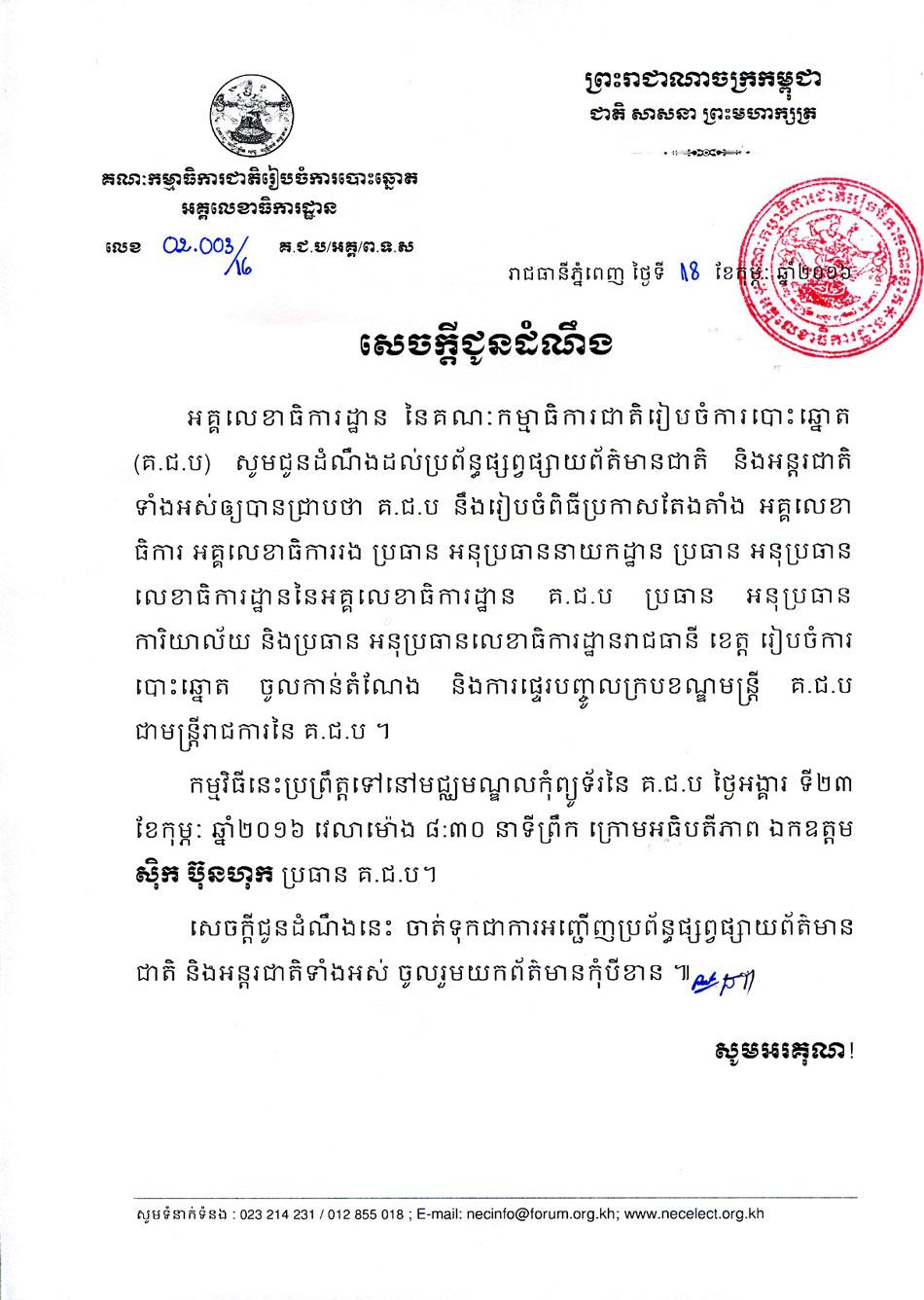 សេចក្តីជូនដំណឹង៖ ស្ដីពីពិធីប្រកាសតែងតាំងអគ្គលេខាធិការ អគ្គលេខាធិការរង ប្រធាន អនុប្រធាននាយកដ្ឋាន ប្រធាន អនុប្រធានលេខាធិការដ្ឋាននៃអគ្គលេខាធិការដ្ឋាន គ.ជ.ប