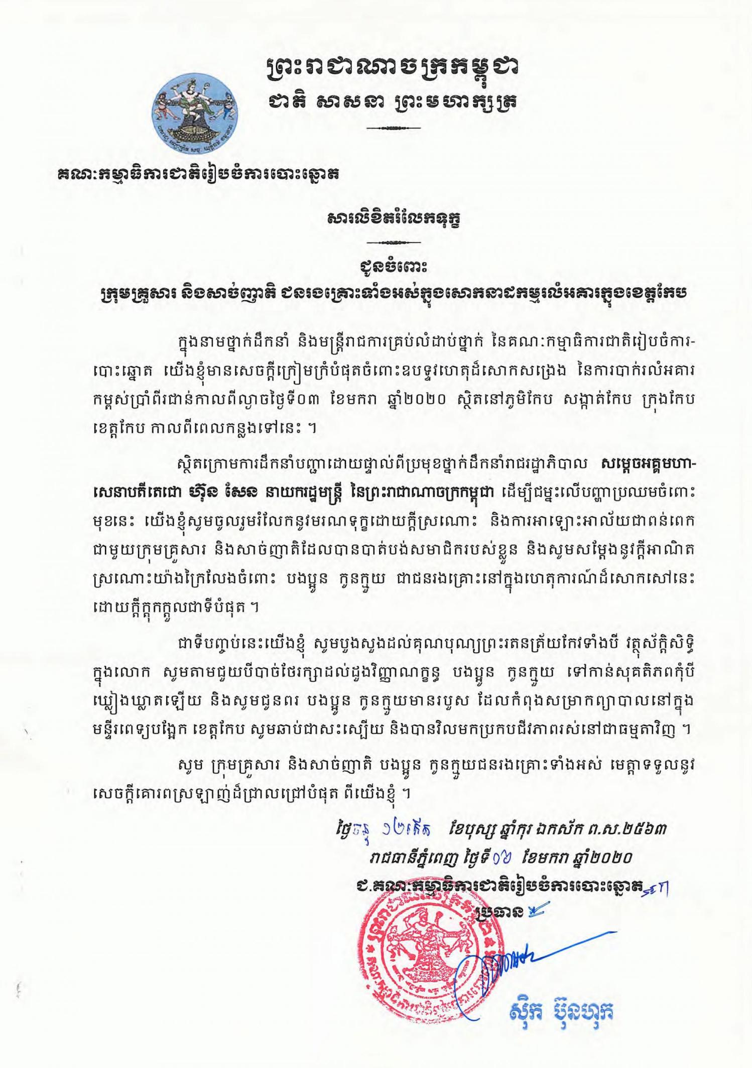 សារលិខិតរំលែកទុក្ខ៖ ជូនចំពោះក្រុមគ្រួសារ និងសាច់ញាតិ ជនរងគ្រោះទាំងអស់ក្នុងសោកនាដកម្មរលំអគារក្នុងខេត្តកែប