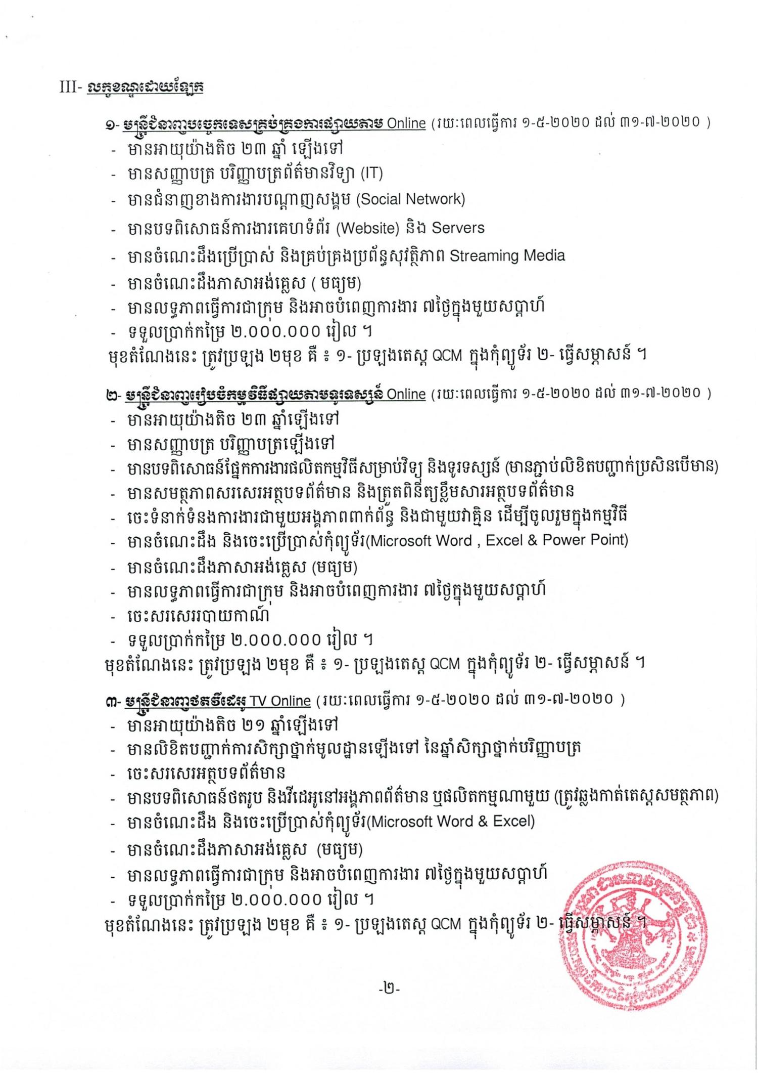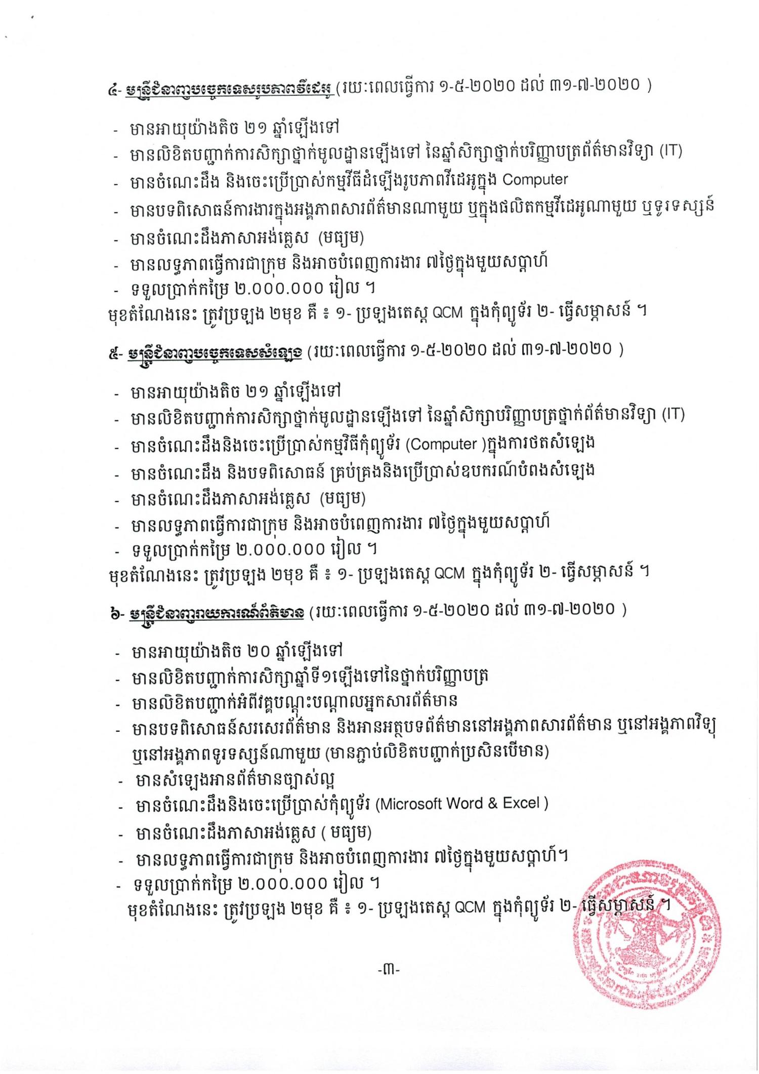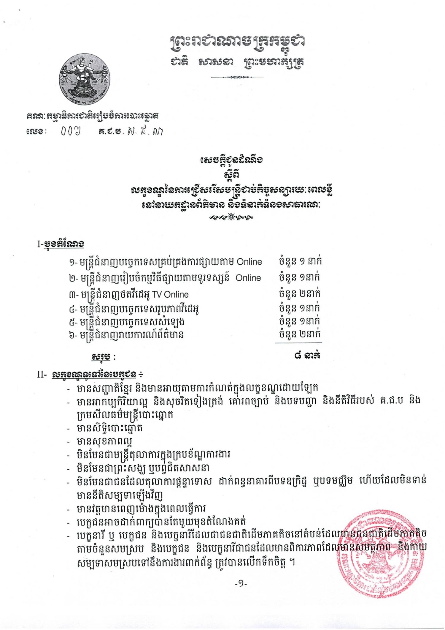 សេចក្តីជូនដំណឹង លេខ ០០៦ ស្តីពីលក្ខខណ្ឌនៃការជ្រើសរើសមន្រី្តកិច្ចសន្យារយៈពេលខ្លី នៅនាយកដ្ឋានព័ត៌មាន និងទំនាក់ទំនងសាធារណៈ