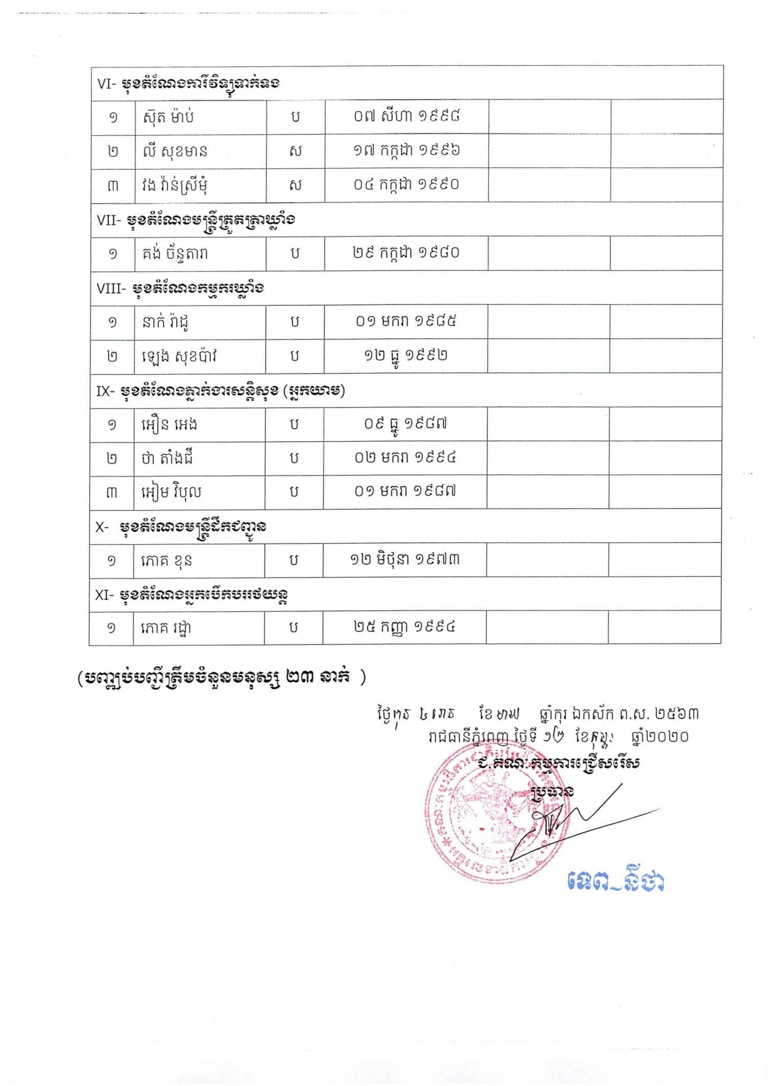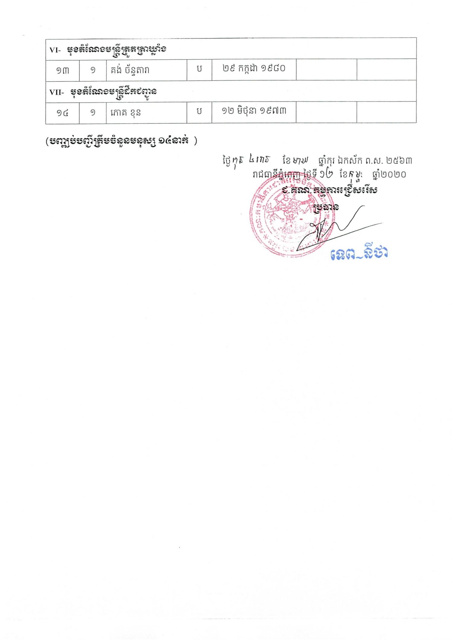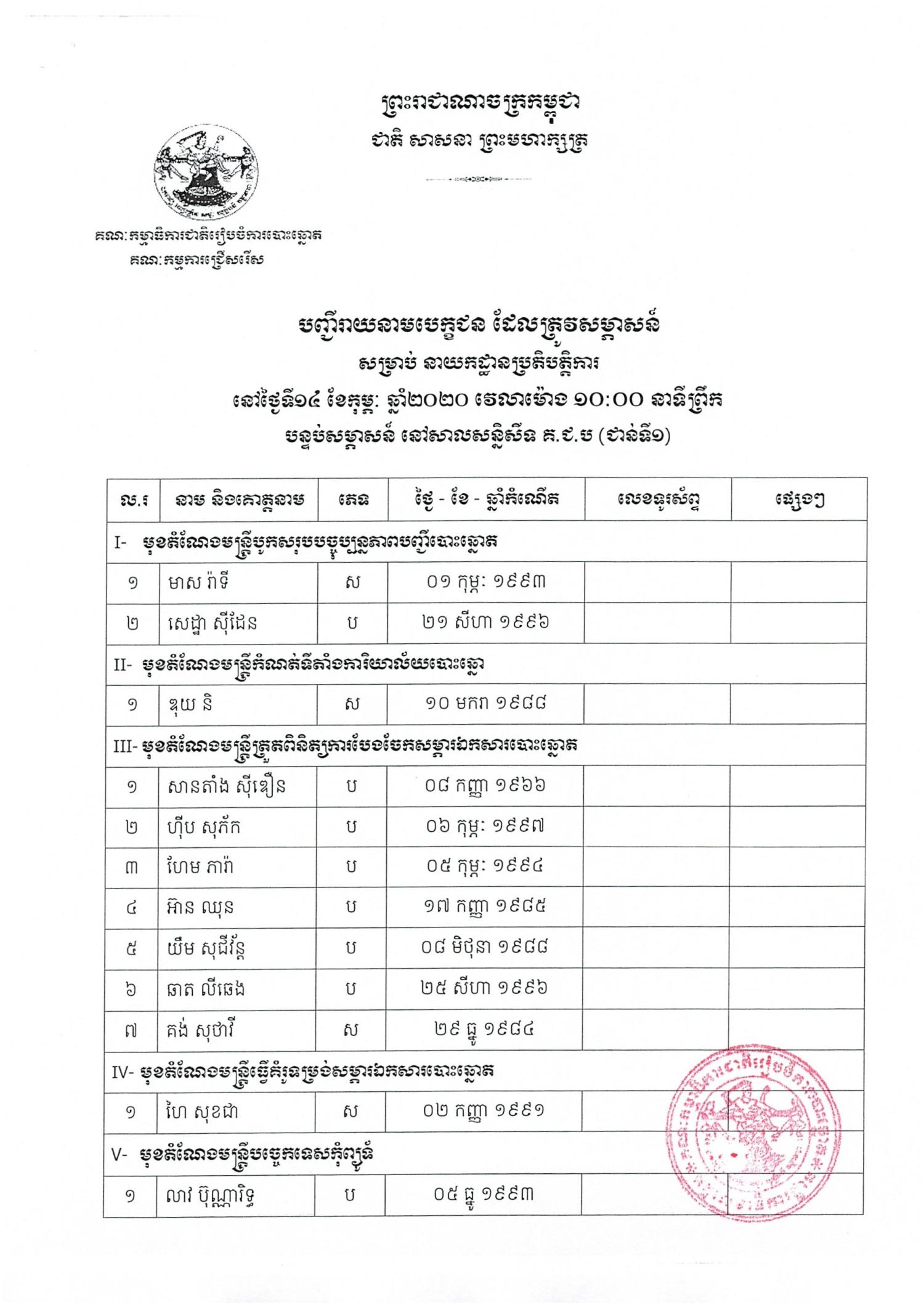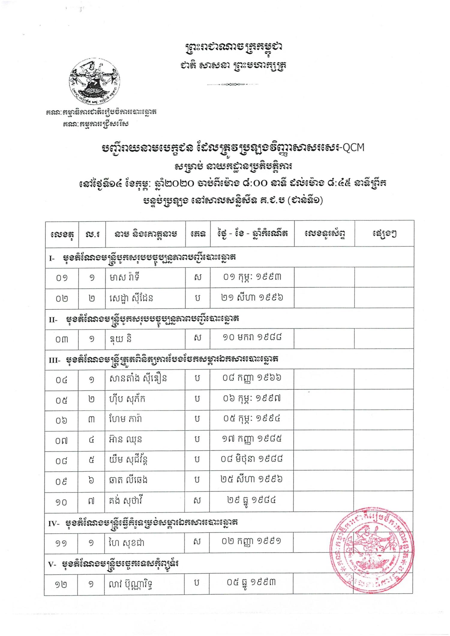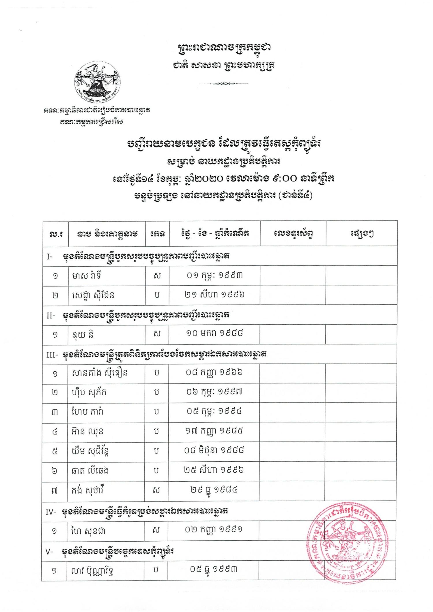 បញ្ជីរាយនាមបេក្ខជនដែលត្រូវប្រឡង សម្រាប់នាយកដ្ឋានប្រតិ្តបត្តិការ នៅថ្ងៃទី១៤ ខែកុម្ភៈ ឆ្នាំ២០២០