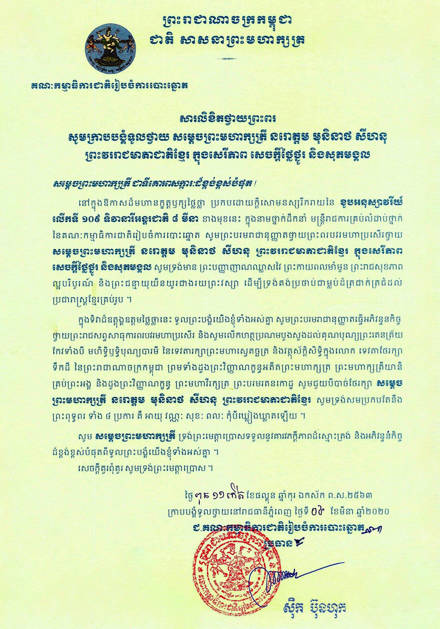 សារលិខិតថ្វាយព្រះពរ សម្តេចព្រះមហាក្សត្រី នរោត្តម មុនិនាថ សីហនុ
