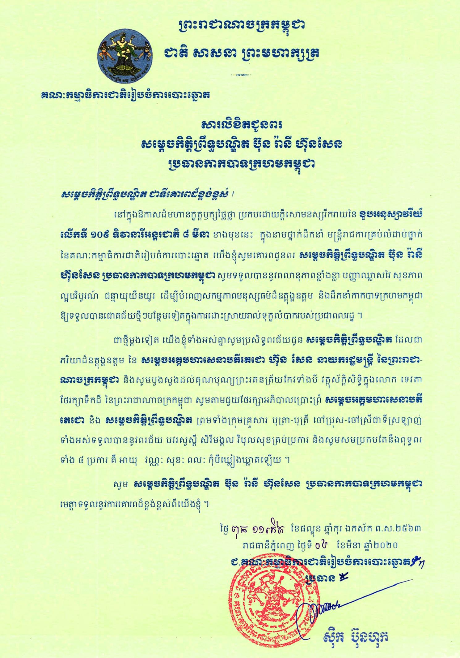 សារលិខិតជូនពរ សម្តេចកិត្តិព្រឹទ្ធ បណ្ឌិត ប៊ុន រ៉ានី ហ៊ុនសែន