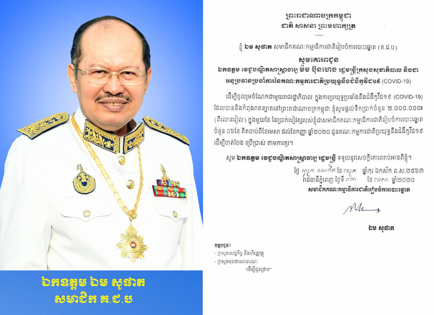 ឯកឧត្តម ឯម សូផាត សមាជិក គ.ជ.ប ស្ម័គ្រចិត្តចូលរួមបរិច្ចាគ ទឹកប្រាក់ ២លានរៀល ក្នុងមួយខែ នៃប្រាក់បៀវត្សជាសមាជិក គ.ជ.ប ចំនួន ៦ខែ គិតចាប់ពីខែមេសានេះតទៅ ជូនដល់គណៈកម្មការជាតិប្រយុទ្ធប្រឆាំងនឹងជំងឺកូវីដ១៩