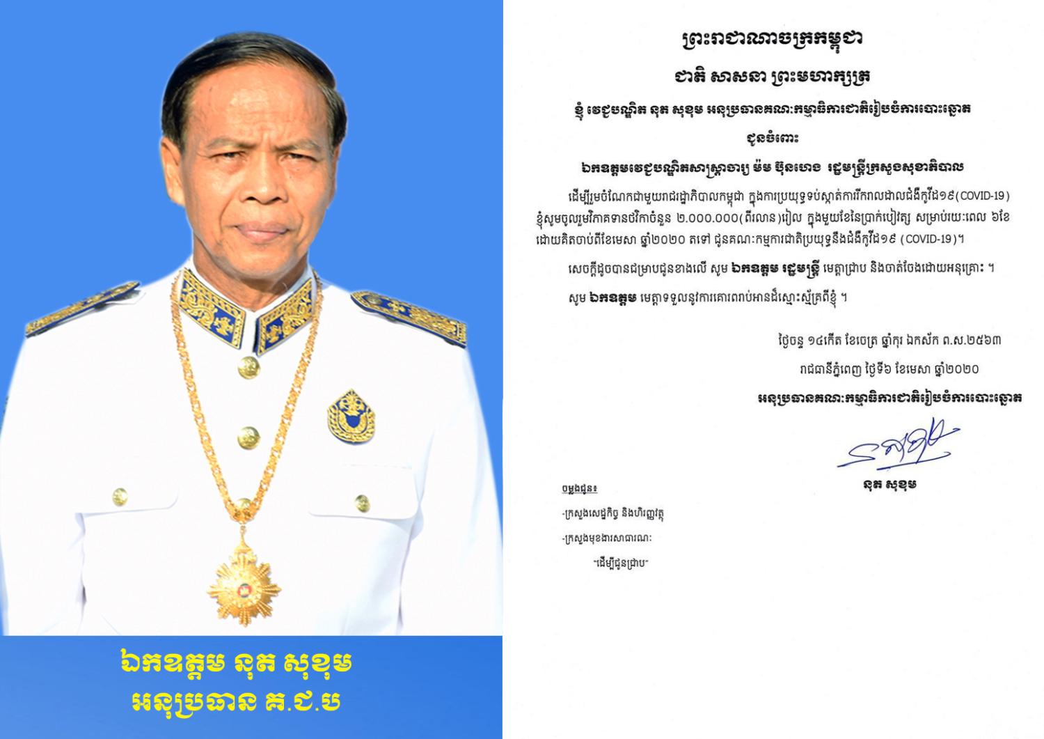 ឯកឧត្តម នុត សុខុម អនុប្រធាន គ.ជ.ប ស្ម័គ្រចិត្តចូលរួមបរិច្ចាគ ទឹកប្រាក់ ២លានរៀល ក្នុងមួយខែ នៃប្រាក់បៀវត្ស ចំនួន ៦ខែ គិតចាប់ពីខែមេសា នេះតទៅ ជូនដល់គណៈកម្មការជាតិប្រយុទ្ធប្រឆាំងនឹងជំងឺកូវីដ១៩