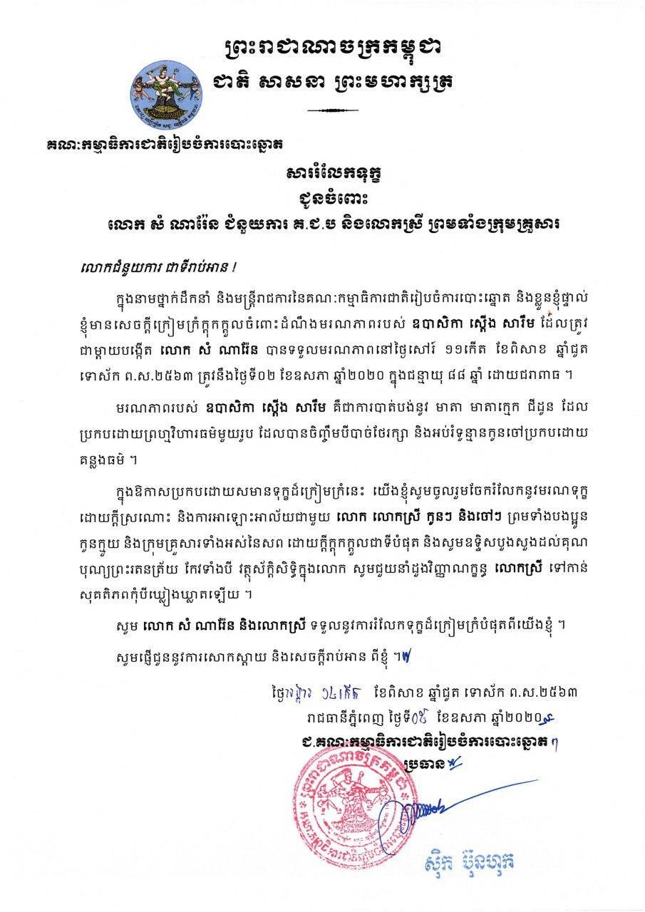 សាររំលែកទុក្ខ ជូនចំពោះ លោក សំ ណារ៉ែន ជំនួយការ គ.ជ.ប និងលោកស្រី ព្រមទាំងក្រុមគ្រួសារ