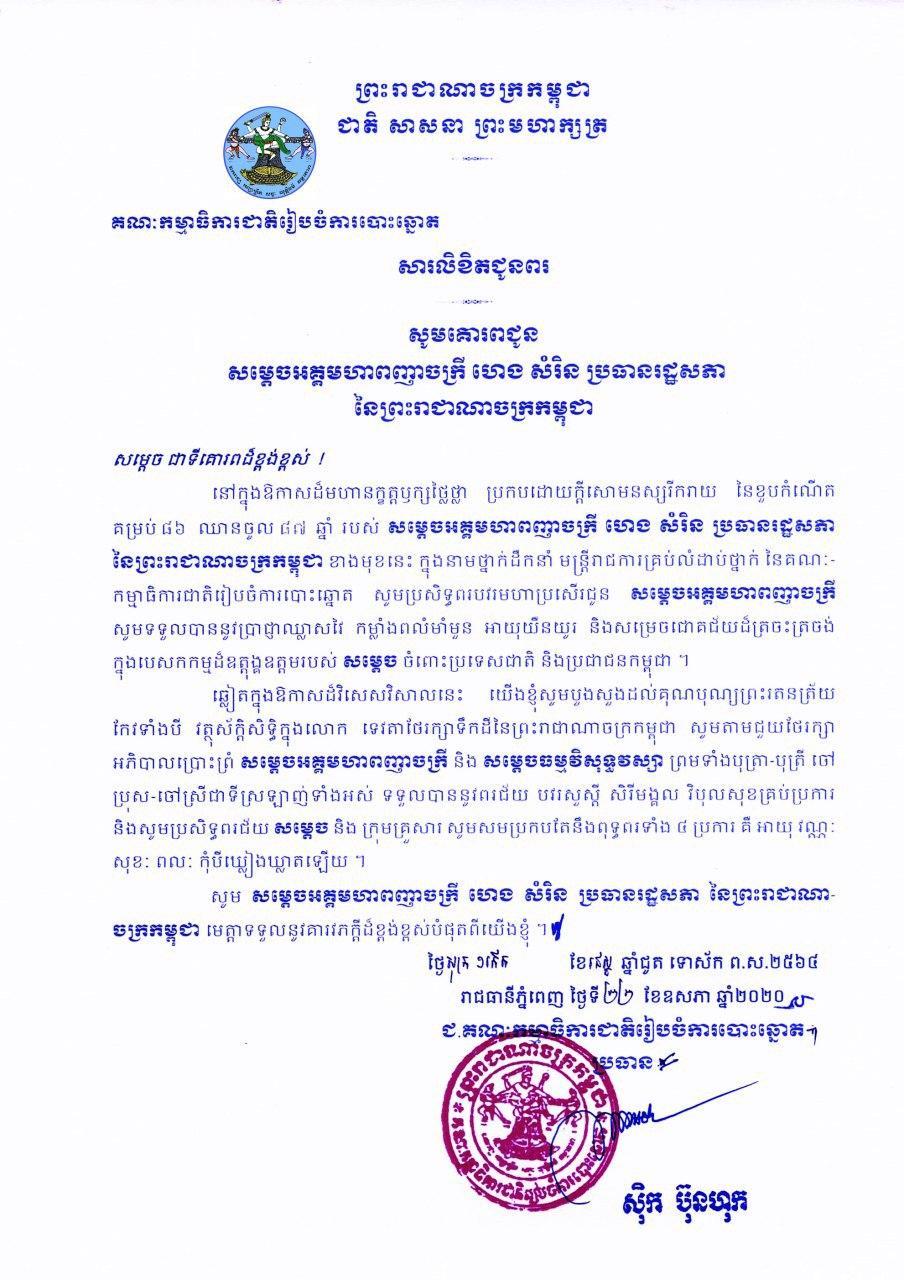 សារលិខិតជូនពរ សម្ដេចអគ្គមហាពញាចក្រី ហេង សំរិន ប្រធានរដ្ឋសភា នៃព្រះរាជាណាចក្រកម្ពុជា ក្នុងឱកាសបុណ្យចម្រើនជន្មាយុគម្រប់ ៨៦ឆ្នាំ ឈានចូល ៨៧ឆ្នាំ