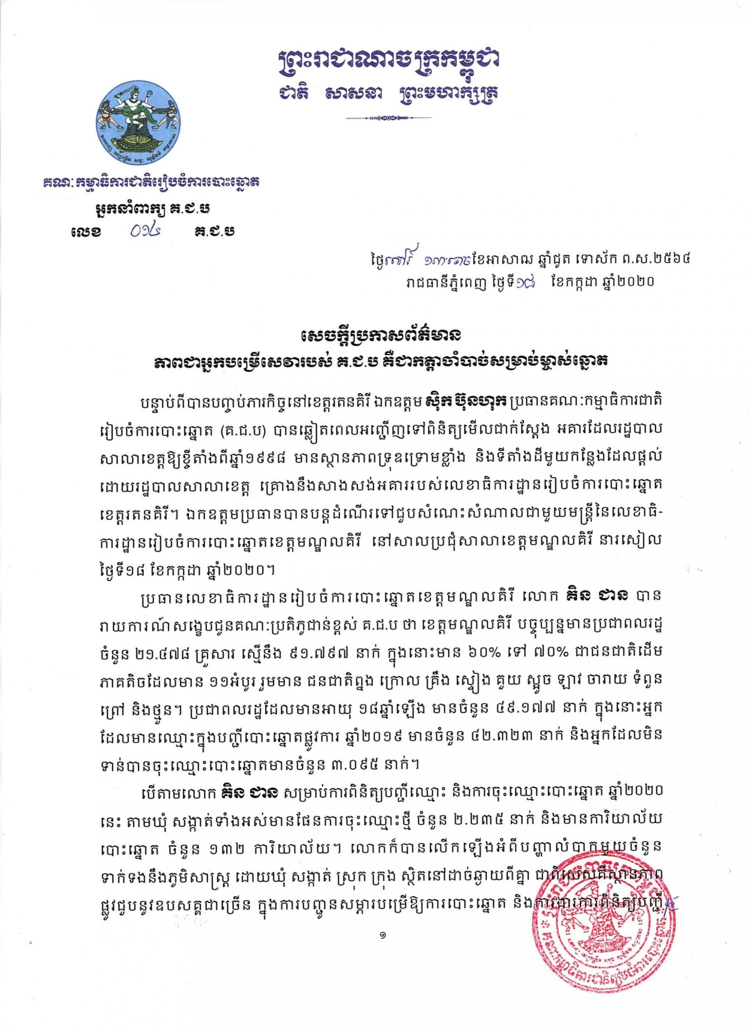 ប្រធានលេខាធិការដ្ឋានរៀបចំការបោះឆ្នោតខេត្តមណ្ឌលគិរី លោក គិន ជាន បានរាយការណ៍សង្ខេបជូនគណៈប្រតិភូជាន់ខ្ពស់ គ.ជ.ប ថា ខេត្តមណ្ឌលគិរី បច្ចុប្បន្នមានប្រជាពលរដ្ឋចំនួន ២១.៤៧៨ គ្រួសារ ស្មើនឹង ៩១.៧៩៧ នាក់ ក្នុងនោះមាន ៦០% ទៅ ៧០% ជាជនជាតិដើមភាគតិចដែលមាន ១១អំបូរ រួមមាន ជនជាតិព្នង ក្រោល គ្រឹង ស្ទៀង គួយ ស្អូច ឡាវ ចារាយ ទំពួន ព្រៅ និងថ្មួន។ ប្រជាពលរដ្ឋដែលមានអាយុ ១៨ឆ្នាំឡើង មានចំនួន ៤៩.១៧៧ នាក់ ក្នុងនោះអ្នកដែលមានឈ្មោះក្នុងបញ្ជីបោះឆ្នោតផ្លូវការ ឆ្នាំ២០១៩ មានចំនួន ៤២.៣២៣ នាក់ និងអ្នកដែលមិនទាន់បានចុះឈ្មោះបោះឆ្នោតមានចំនួន ៣.០៩៥ នាក់។
