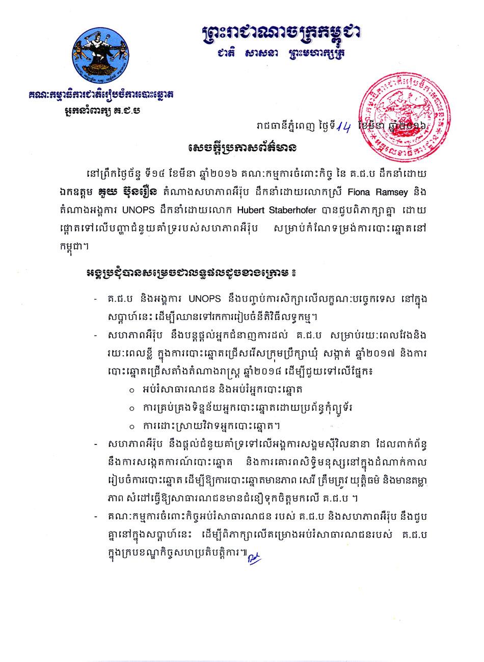 គណៈកម្មការចំពោះកិច្ច នៃ គ.ជ.ប ដឹកនាំដោយ ឯកឧត្តម គួយ ប៊ុនរឿន តំណាងសហភាពអឺរ៉ុប ដឹកនាំដោយលោកស្រី Fiona Ramsey និងតំណាងអង្គការ UNOPS ដឹកនាំដោយលោក Hubert Staberhofer បានជួបពិភាក្សាគ្នា