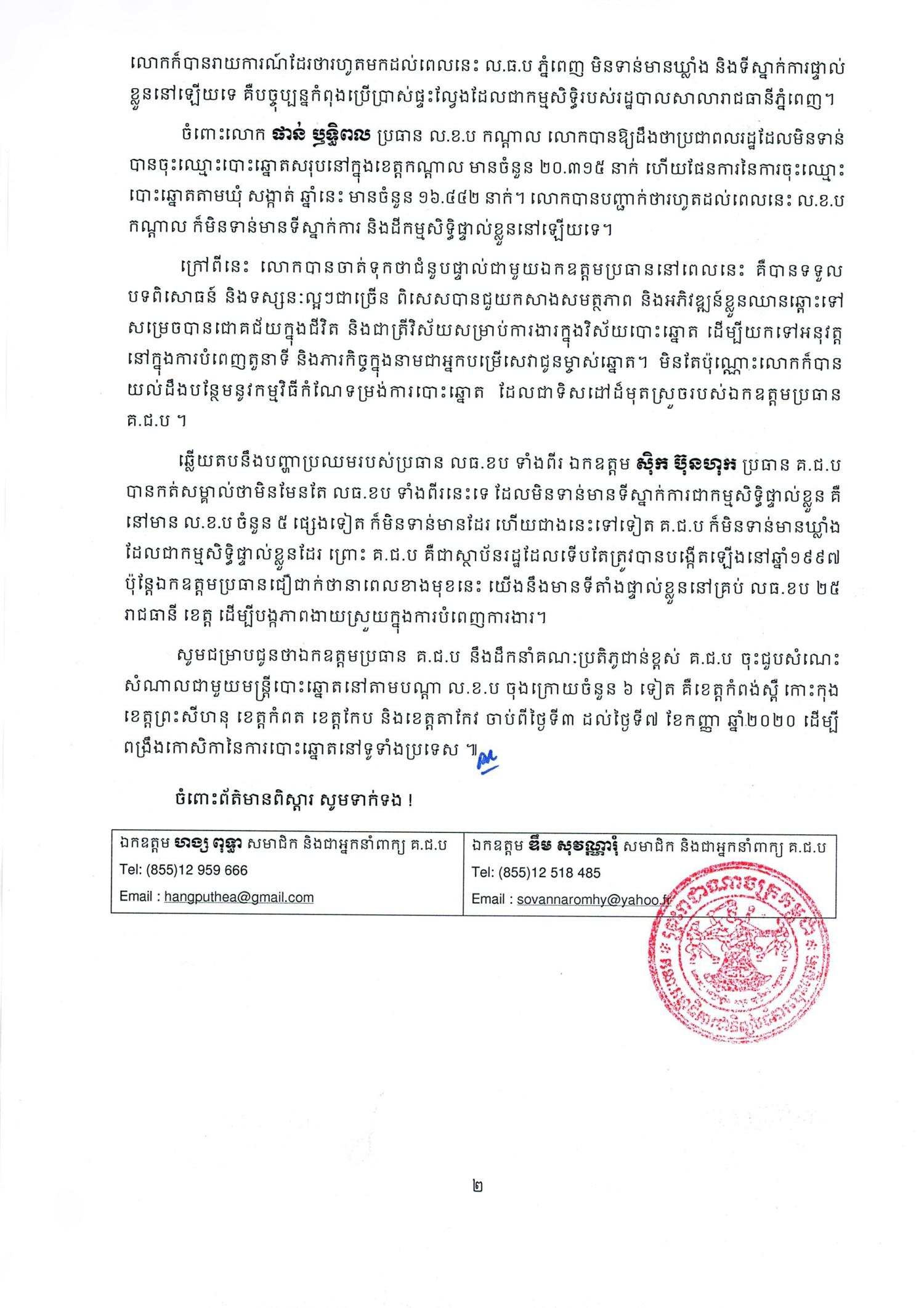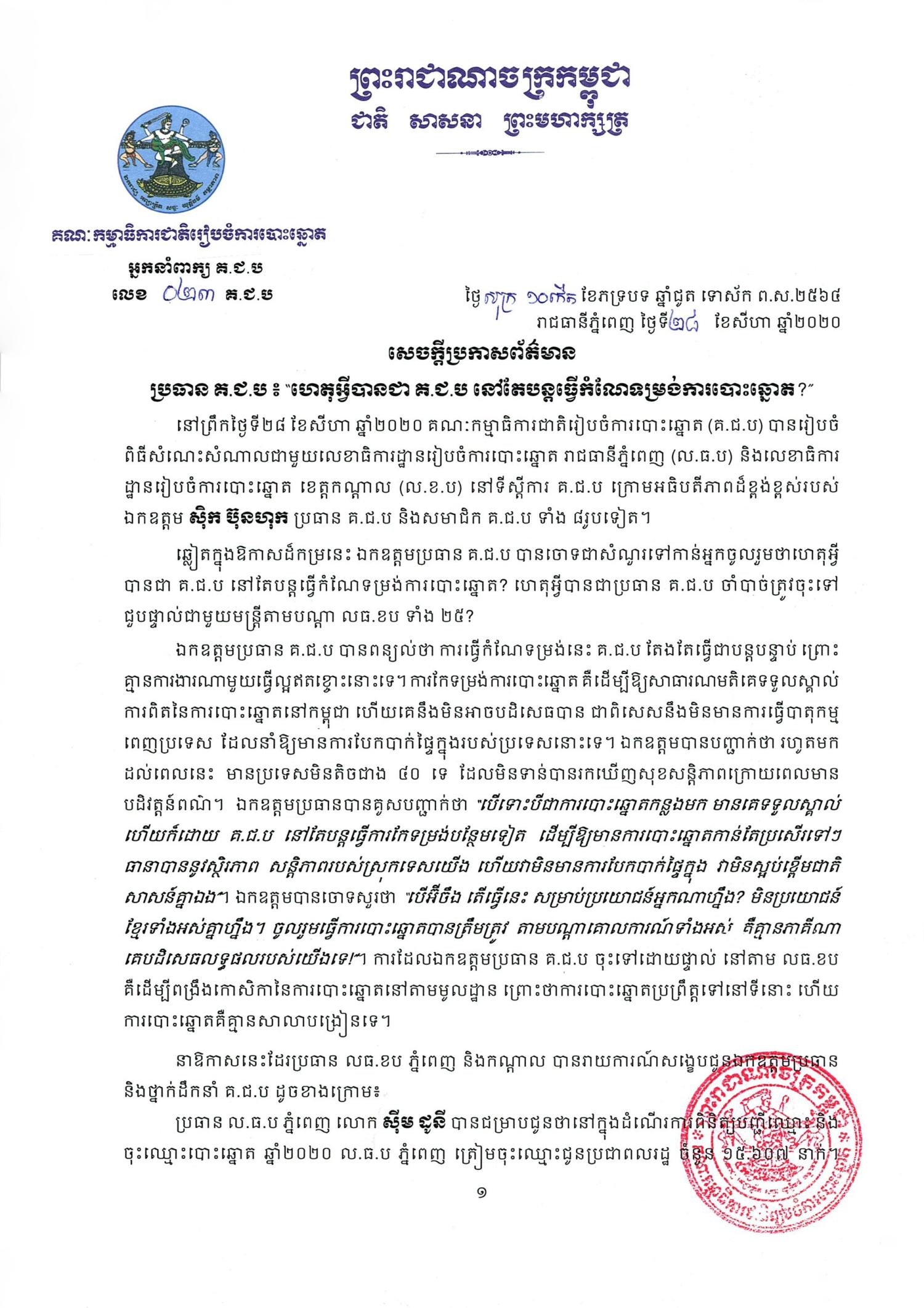 នៅព្រឹកថ្ងៃទី២៨ ខែសីហា ឆ្នាំ២០២០ គណៈកម្មាធិការជាតិរៀបចំការបោះឆ្នោត (គ.ជ.ប) បានរៀបចំពិធីសំណេះសំណាលជាមួយលេខាធិការដ្ឋានរៀបចំការបោះឆ្នោត រាជធានីភ្នំពេញ (ល.ធ.ប) និងលេខាធិការដ្ឋានរៀបចំការបោះឆ្នោត ខេត្តកណ្តាល (ល.ខ.ប) នៅទីស្តីការ គ.ជ.ប ក្រោមអធិបតីភាពដ៏ខ្ពង់ខ្ពស់របស់ឯកឧត្តម ស៊ិក ប៊ុនហុក ប្រធាន គ.ជ.ប និងសមាជិក គ.ជ.ប ទាំង ៨រូបទៀត។
