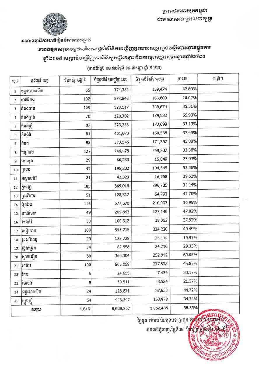 តារាងបូកសរុបលទ្ធផលនៃការផ្ដល់លិខិតអញ្ជើញអ្នកមានឈ្មោះក្នុងបញ្ជីបោះឆ្នោតផ្លូវការ ឆ្នាំំ២០១៩ សម្រាប់បម្រើឱ្យការពិនិត្យបញ្ជីឈ្មោះ និងការចុះឈ្មោះបោះឆ្នោត ឆ្នាំ២០២០ (ចាប់ពីថ្ងៃទី០១ ដល់ថ្ងៃទី ០៨ ខែកញ្ញា ឆ្នាំ២០២០)