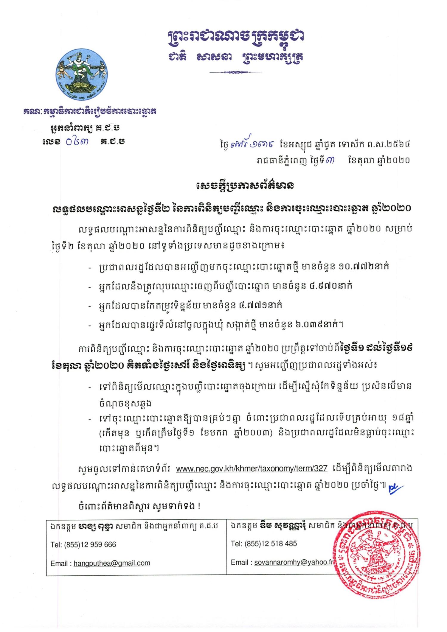 លទ្ធផលបណ្តោះអាសន្ននៃការពិនិត្យបញ្ជីឈ្មោះ និងការចុះឈ្មោះបោះឆ្នោត ឆ្នាំ២០២០ សម្រាប់ថ្ងៃទី២ ខែតុលា ឆ្នាំ២០២០ នៅទូទាំងប្រទេសមានដូចខាងក្រោម៖