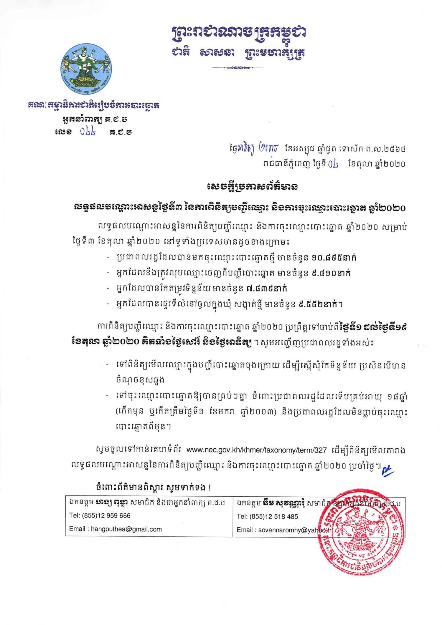 លទ្ធផលបណ្តោះអាសន្ននៃការពិនិត្យបញ្ជីឈ្មោះ និងការចុះឈ្មោះបោះឆ្នោត ឆ្នាំ២០២០ សម្រាប់ថ្ងៃទី៣ ខែតុលា ឆ្នាំ២០២០ នៅទូទាំងប្រទេសមានដូចខាងក្រោម៖