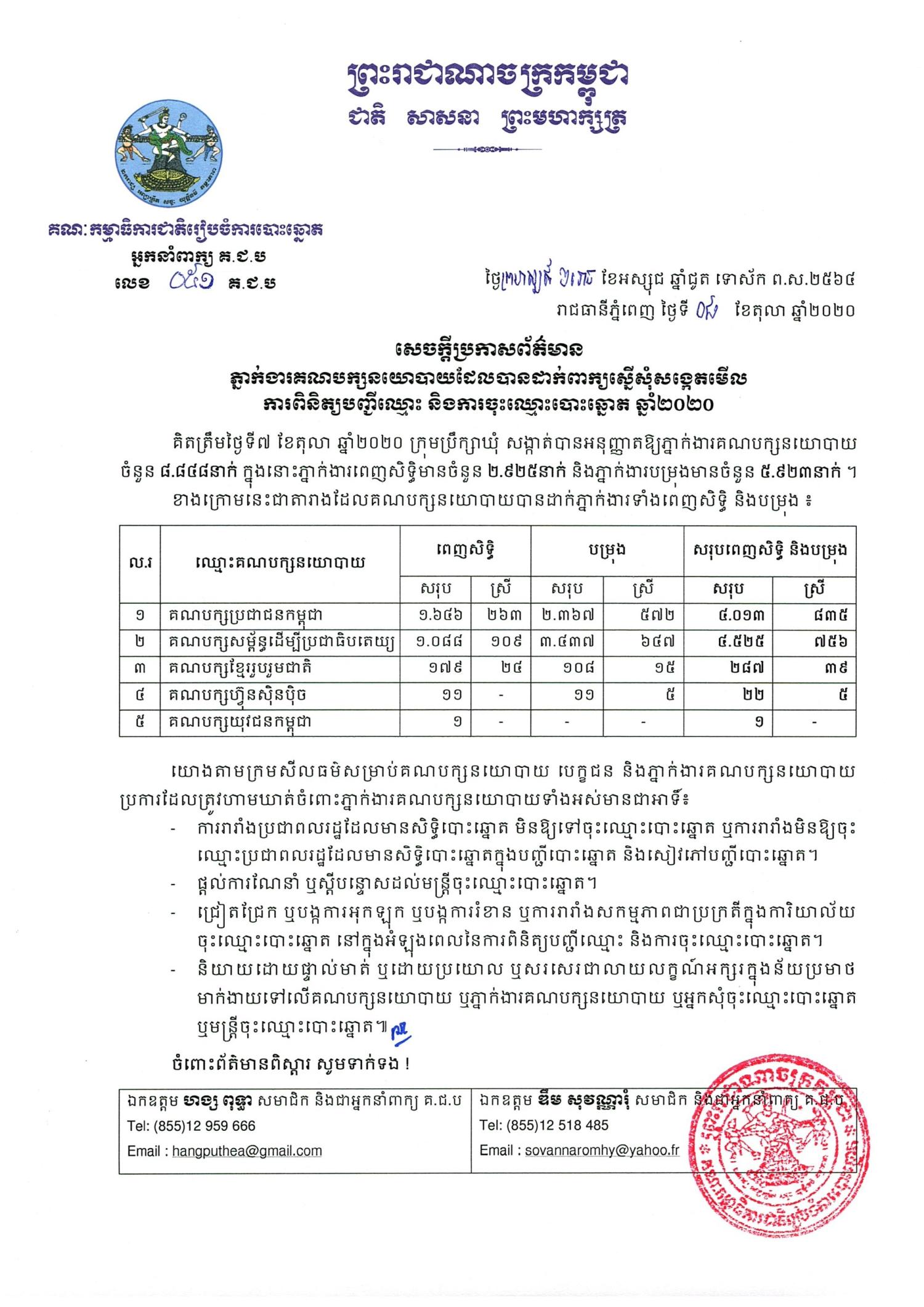 សេចក្តីប្រកាសព័ត៌មាន លេខ ០៥១ ៖ ភ្នាក់ងារគណបក្សនយោបាយដែលបានដាក់ពាក្យស្នើសុំសង្កេតមើល ការពិនិត្យបញ្ជីឈ្មោះ និងការចុះឈ្មោះបោះឆ្នោត ឆ្នាំ២០២០