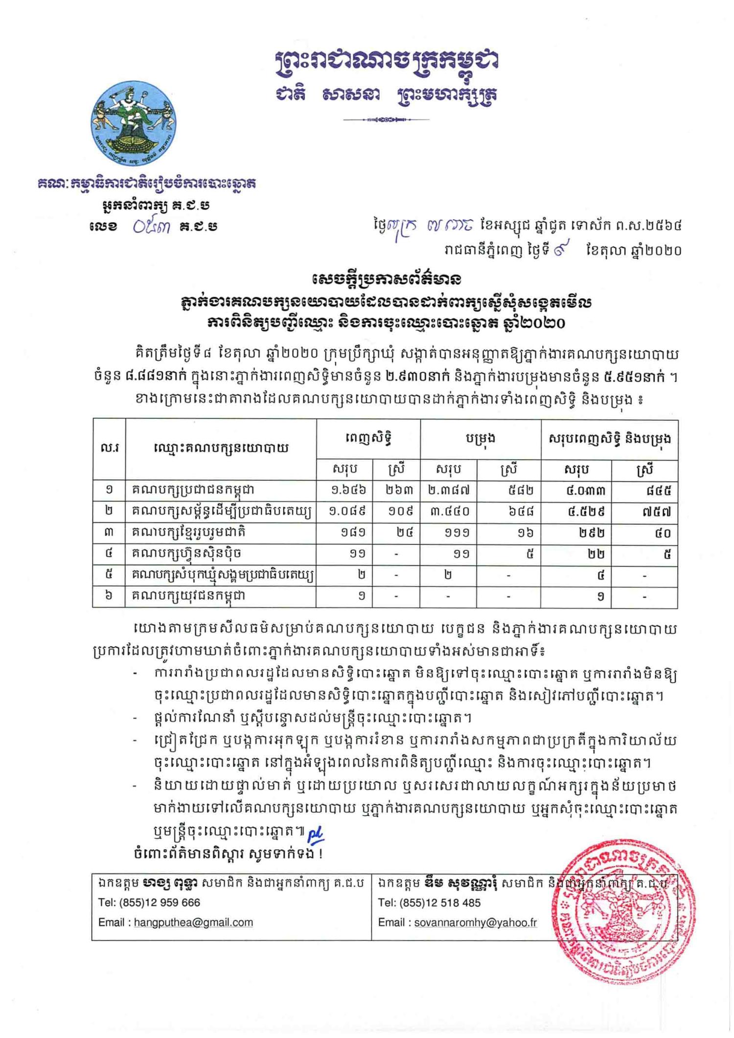 សេចក្តីប្រកាសព័ត៌មាន លេខ ០៥៣ ៖ ភ្នាក់ងារគណបក្សនយោបាយដែលបានដាក់ពាក្យស្នើសុំសង្កេតមើល ការពិនិត្យបញ្ជីឈ្មោះ និងការចុះឈ្មោះបោះឆ្នោត ឆ្នាំ២០២០ (គិតត្រឹមថ្ងៃទី៨ ខែតុលា ឆ្នាំ២០២០)
