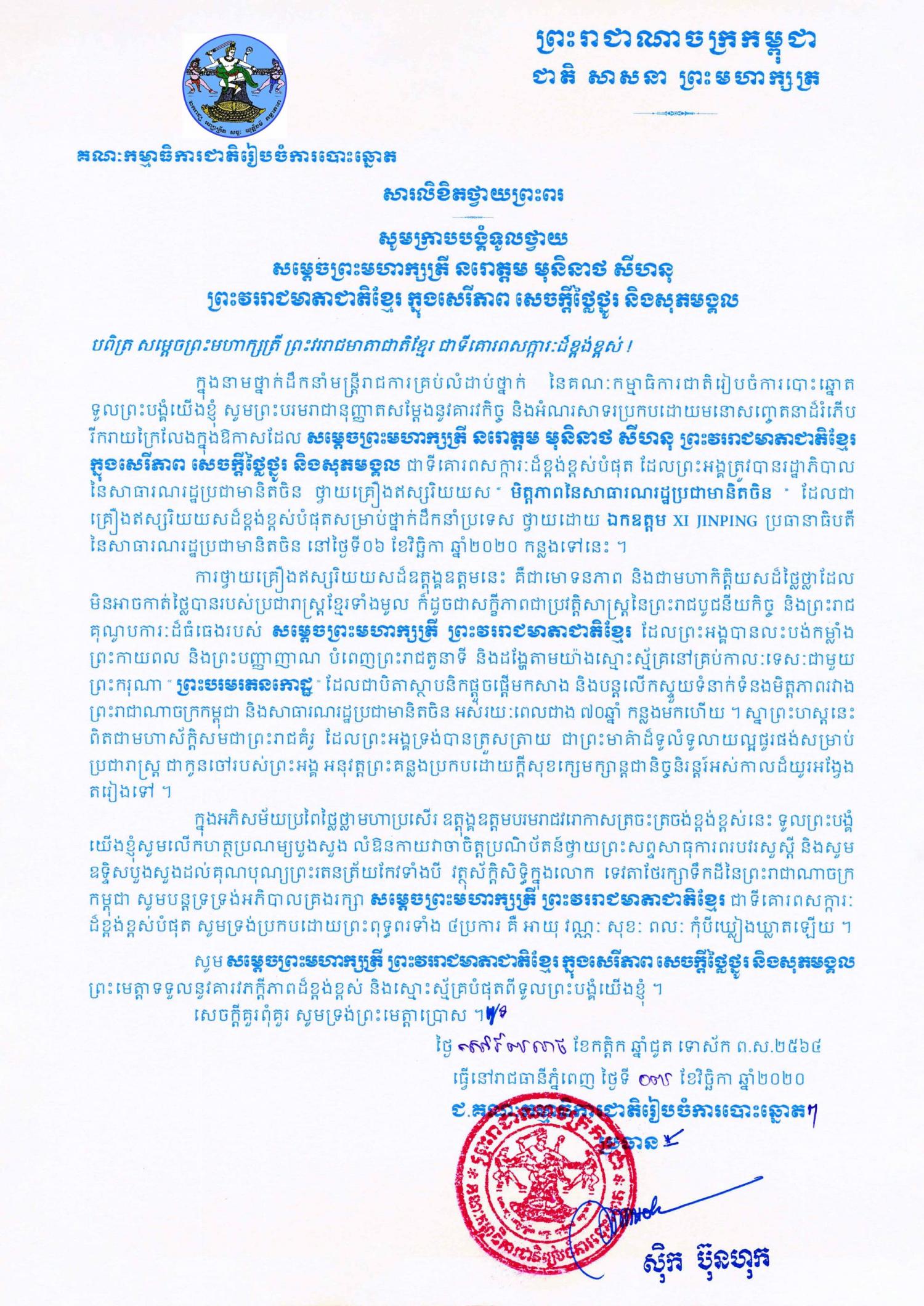 សារលិខិតថ្វាយព្រះពរ ៖ សូមក្រាបបង្គំទូលថ្វាយ សម្ដេចព្រះមហាក្សត្រី នរោត្ដម មុនិនាថ សីហនុ ព្រះវររាជមាតាជាតិខ្មែរ ក្នុងសេរីភាព សេចក្ដីថ្លៃថ្នូរ និងសុភមង្គល