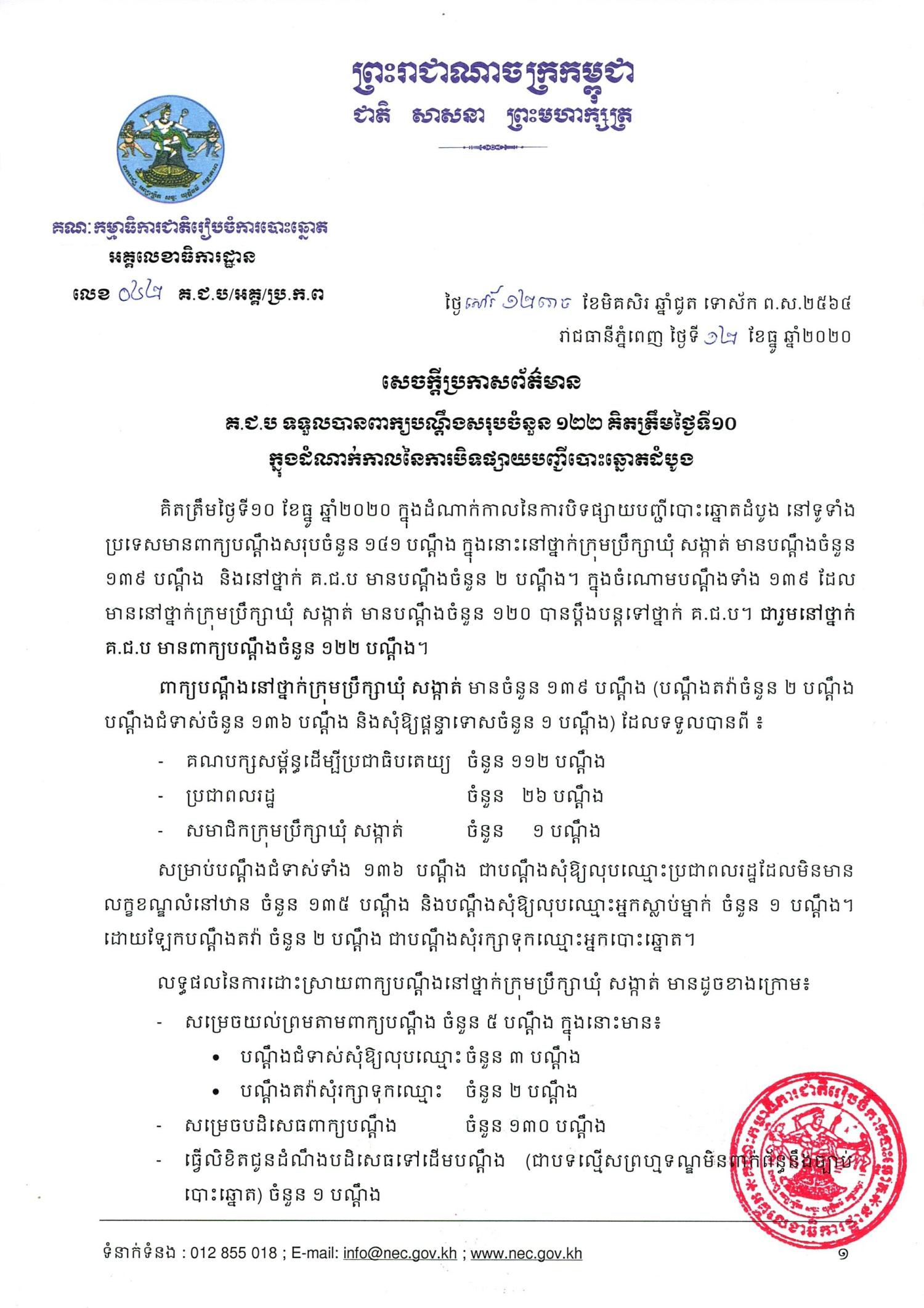 គិតត្រឹមថ្ងៃទី១០ ខែធ្នូ ឆ្នាំ២០២០ ក្នុងដំណាក់កាលនៃការបិទផ្សាយបញ្ជីបោះឆ្នោតដំបូង នៅទូទាំងប្រទេសមានពាក្យបណ្តឹងសរុបចំនួន ១៤១ បណ្តឹង ក្នុងនោះនៅថ្នាក់ក្រុមប្រឹក្សាឃុំ សង្កាត់ មានបណ្តឹងចំនួន ១៣៩ បណ្តឹង និងនៅថ្នាក់ គ.ជ.ប មានបណ្តឹងចំនួន ២ បណ្តឹង។ ក្នុងចំណោមបណ្តឹងទាំង ១៣៩ ដែលមាននៅថ្នាក់ក្រុមប្រឹក្សាឃុំ សង្កាត់ មានបណ្តឹងចំនួន ១២០ បានប្តឹងបន្តទៅថ្នាក់ គ.ជ.ប។ ជារួមនៅថ្នាក់ គ.ជ.ប មានពាក្យបណ្តឹងចំនួន ១២២ បណ្តឹង។
