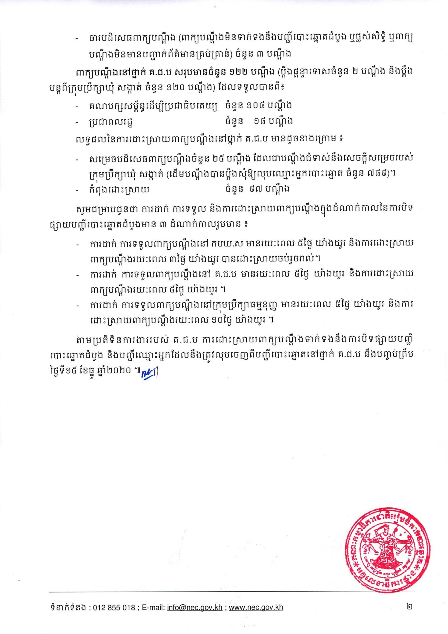 - សម្រេចបដិសេធពាក្យបណ្តឹងចំនួន ២៥ បណ្តឹង ដែលជាបណ្តឹងជំទាស់នឹងសេចក្តីសម្រេចរបស់ក្រុមប្រឹក្សាឃុំ សង្កាត់ (ដើមបណ្តឹងបានប្តឹងសុំឱ្យលុបឈ្មោះអ្នកបោះឆ្នោត ចំនួន ៧៨៩)។