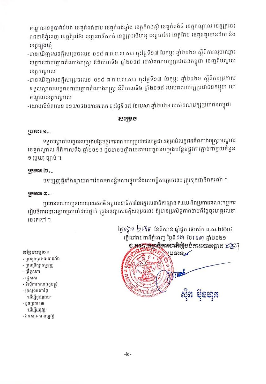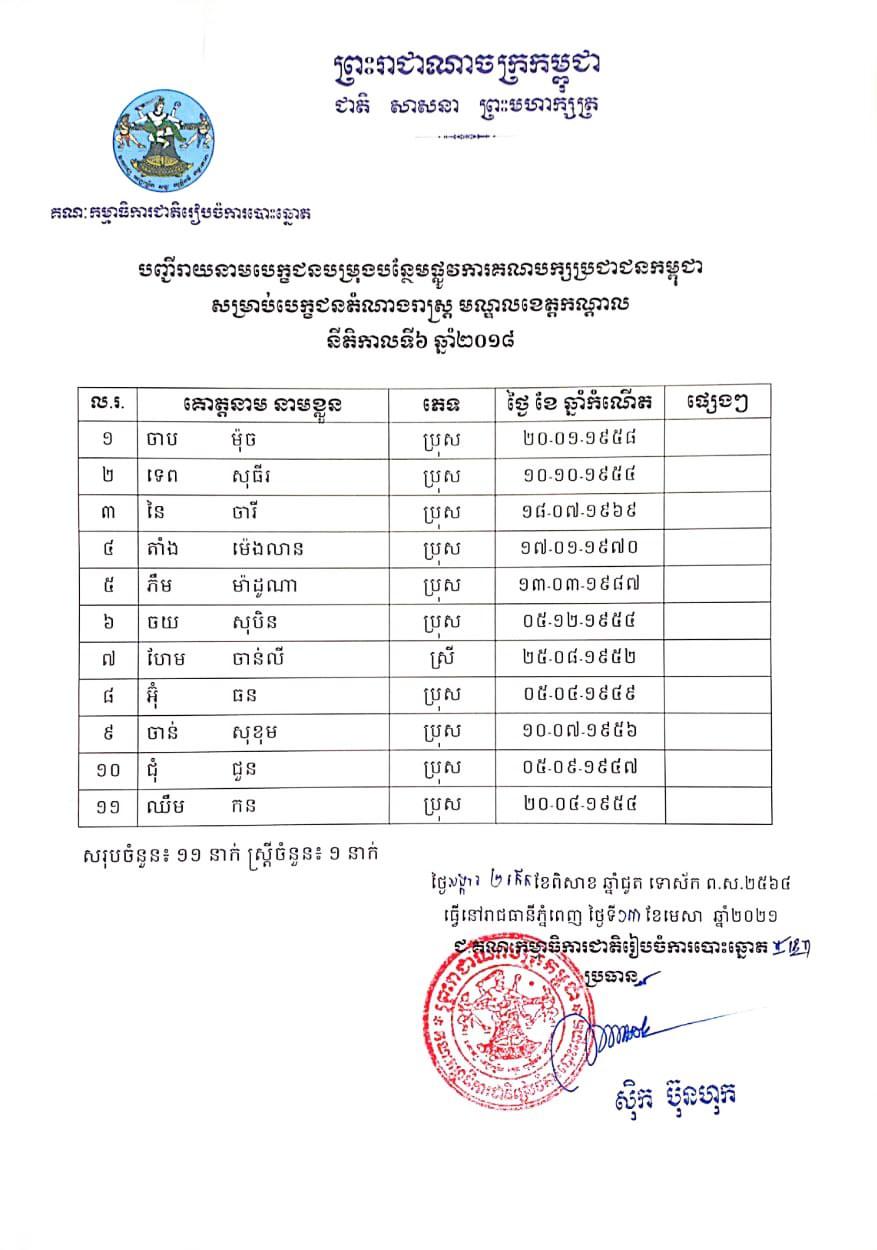 សេចក្ដីសម្រេច លេខ ០៤២ គ.ជ.ប.ស.ស.រ ស្ដីពីការប្រកាសទទួលស្គាល់បេក្ខជនបម្រុងបន្ថែមផ្លូវការគណបក្សប្រជាជនកម្ពុជា សម្រាប់បេក្ខជនតំណាងរាស្ត្រ មណ្ឌលខេត្តកណ្ដាល នីតិកាលទី៦ ឆ្នាំ២០១៨