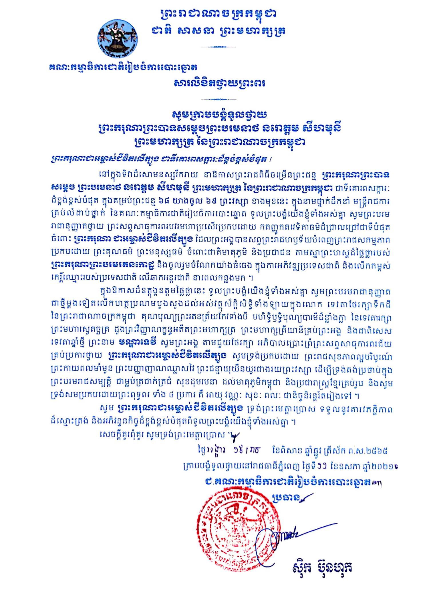 សារលិខិតថ្វាយព្រះពរ ព្រះករុណាព្រះបាទសម្ដេចព្រះបរមនាថ នរោត្តម សីហមុនី ព្រះមហាក្សត្រ នៃព្រះរាជាណាចក្រកម្ពុជា នៅក្នុងទិវាដ៏សោមនស្សរីករាយ នាឱកាសព្រះរាជពិធីចម្រើនព្រះជន្ម