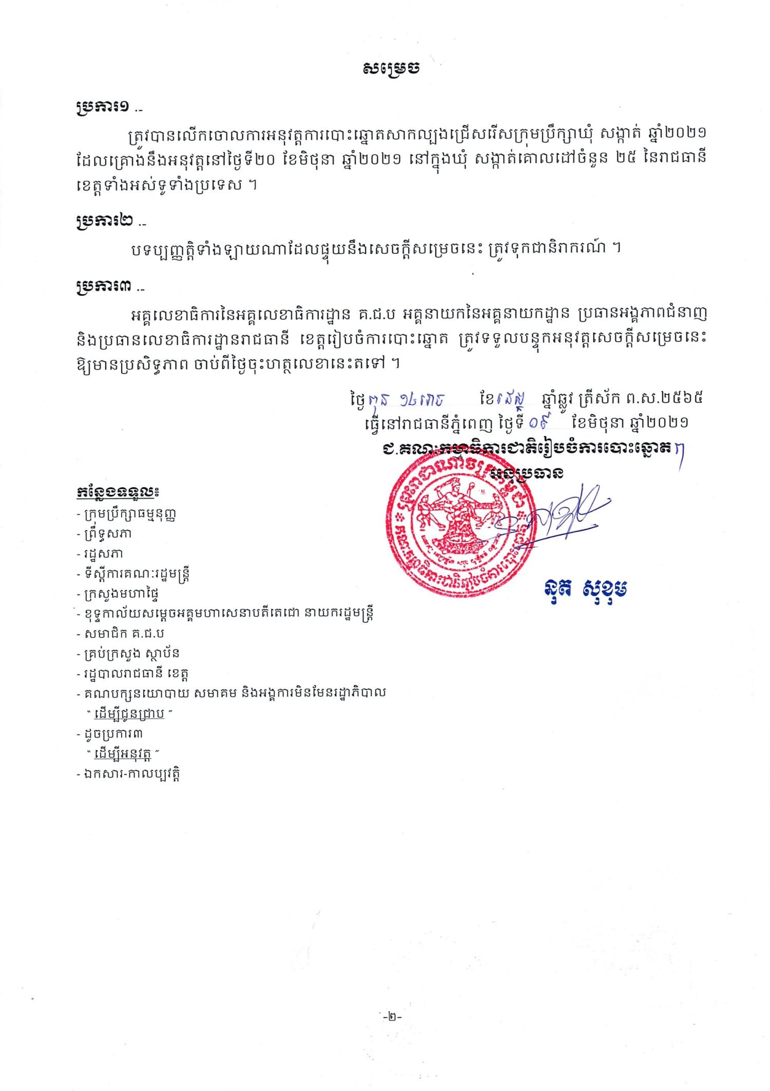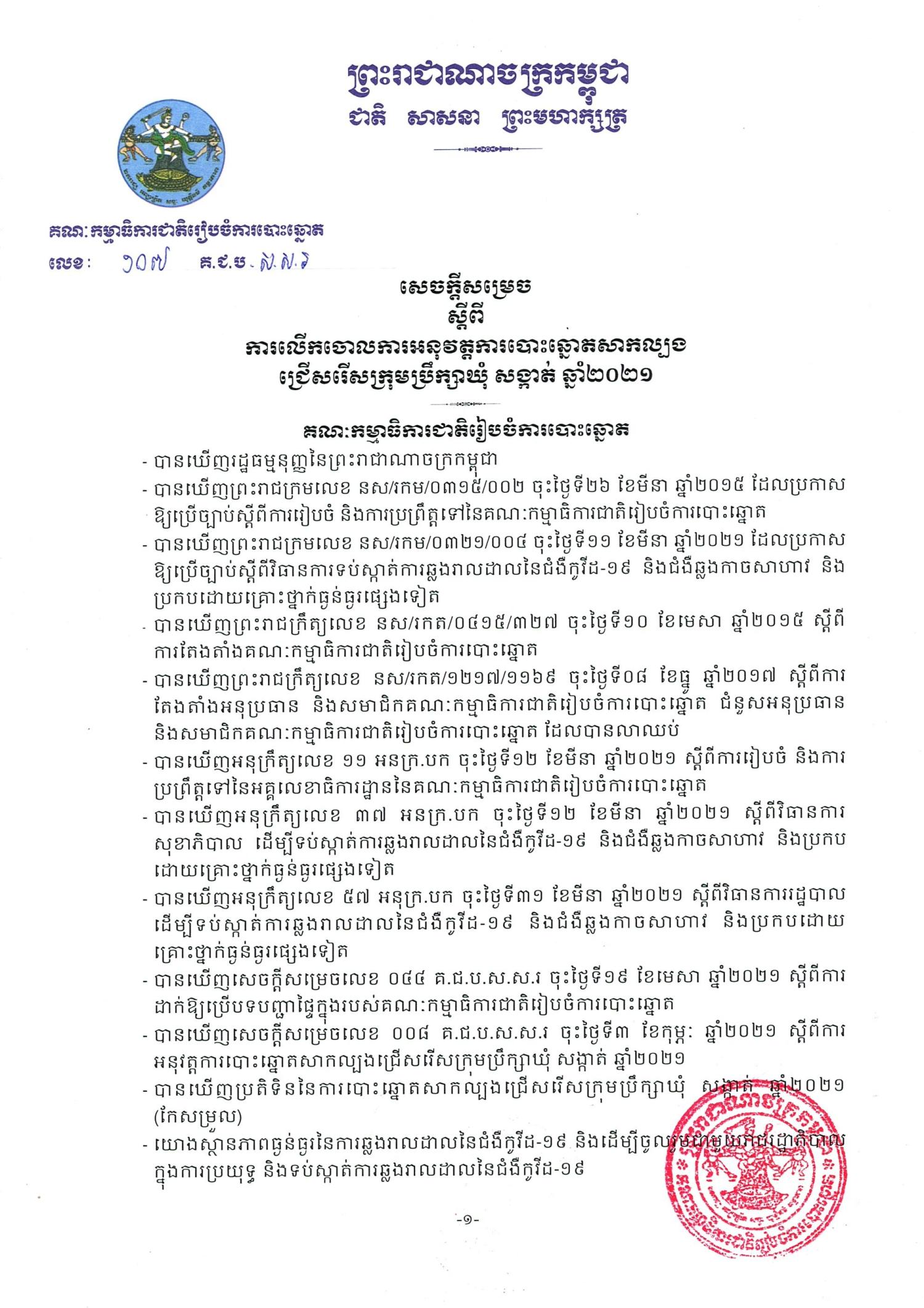 សេចក្ដីសម្រេច លេខ ១០៧ គ.ជ.ប ស.ស.រ ស្ដីពីការលើកចោលការអនុវត្តការបោះឆ្នោតសាកល្បងជ្រើសរើសក្រុមប្រឹក្សាឃុំ សង្កាត់ ឆ្នាំ២០២១