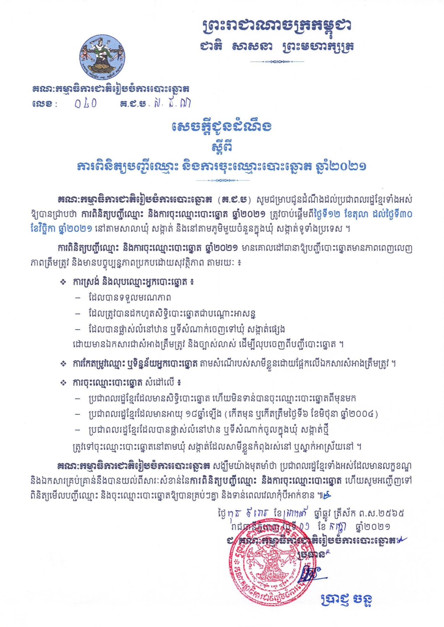 គណៈកម្មាធិការជាតិរៀបចំការបោះឆ្នោត (គ.ជ.ប) សូមជម្រាបជូនដំណឹងដល់ប្រជាពលរដ្ឋខ្មែរទាំងអស់ឱ្យបានជ្រាបថា ការពិនិត្យបញ្ជីឈ្មោះ និងការចុះឈ្មោះបោះឆ្នោត ឆ្នាំ២០២១ ត្រូវចាប់ផ្តើមពីថ្ងៃទី១២ ខែតុលា ដល់ថ្ងៃទី៣០ ខែវិច្ឆិកា ឆ្នាំ២០២១ នៅតាមសាលាឃុំ សង្កាត់ និងនៅតាមភូមិមួយចំនួនក្នុងឃុំ សង្កាត់ទូទាំងប្រទេស ។