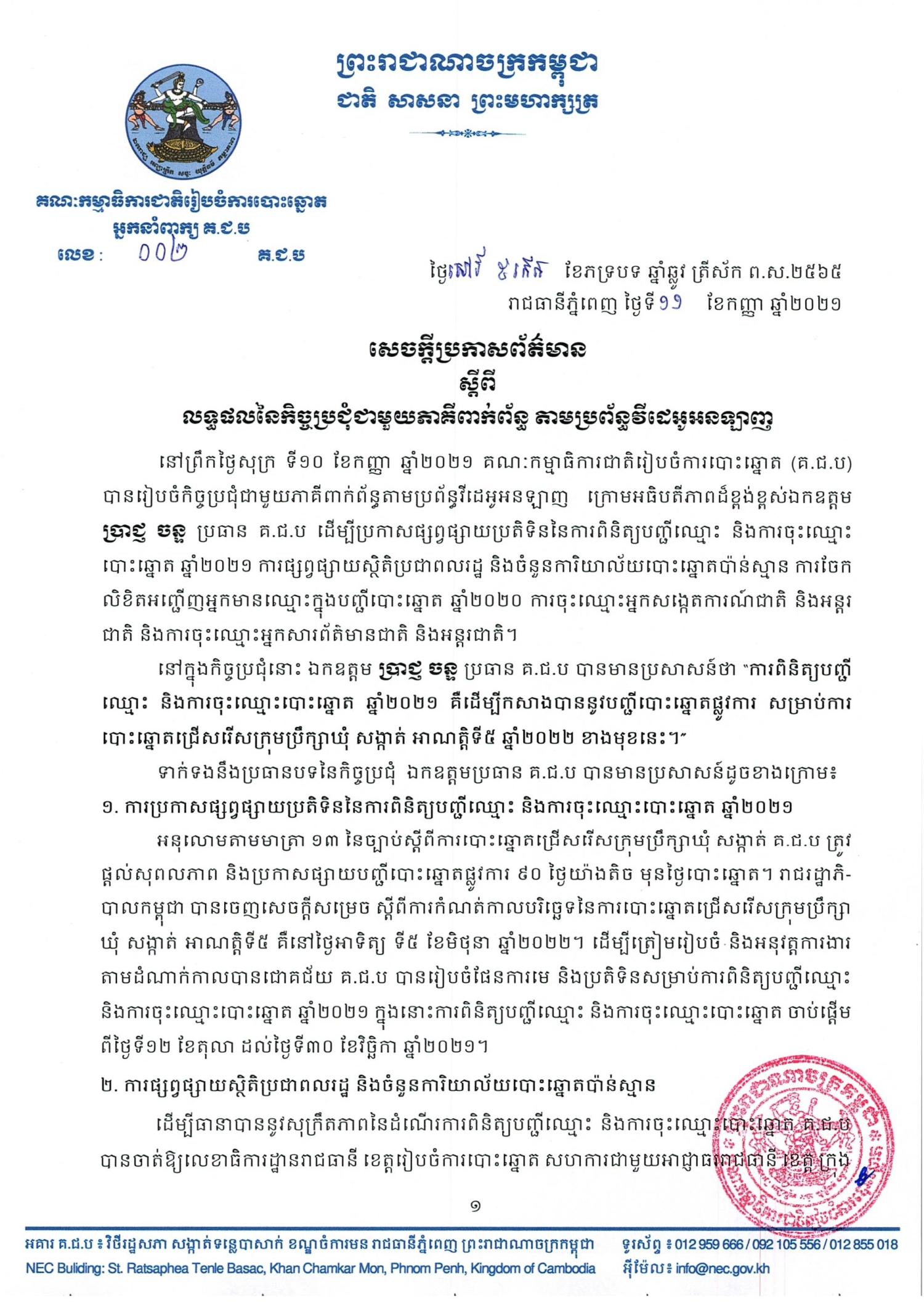 នៅព្រឹកថ្ងៃសុក្រ ទី១០ ខែកញ្ញា ឆ្នាំ២០២១ គណៈកម្មាធិការជាតិរៀបចំការបោះឆ្នោត (គ.ជ.ប) បានរៀបចំកិច្ចប្រជុំជាមួយភាគីពាក់ព័ន្ធតាមប្រព័ន្ធវីដេអូអនឡាញ ក្រោមអធិបតីភាពដ៏ខ្ពង់ខ្ពស់ឯកឧត្តម ប្រាជ្ញ ចន្ទ ប្រធាន គ.ជ.ប ដើម្បីប្រកាសផ្សព្វផ្សាយប្រតិទិននៃការពិនិត្យបញ្ជីឈ្មោះ និងការចុះឈ្មោះបោះឆ្នោត ឆ្នាំ២០២១ ការផ្សព្វផ្សាយស្ថិតិប្រជាពលរដ្ឋ និងចំនួនការិយាល័យបោះឆ្នោតប៉ាន់ស្មាន ការចែកលិខិតអញ្ជើញអ្នកមានឈ្មោះក្នុងបញ្ជីបោះឆ្នោត ឆ្នាំ២០២០ ការចុះឈ្មោះអ្នកសង្កេតការណ៍ជាតិ និងអន្តរជាតិ និងការចុះឈ្មោះអ្នកសារព័ត៌មានជាតិ និងអន្តរជាតិ។