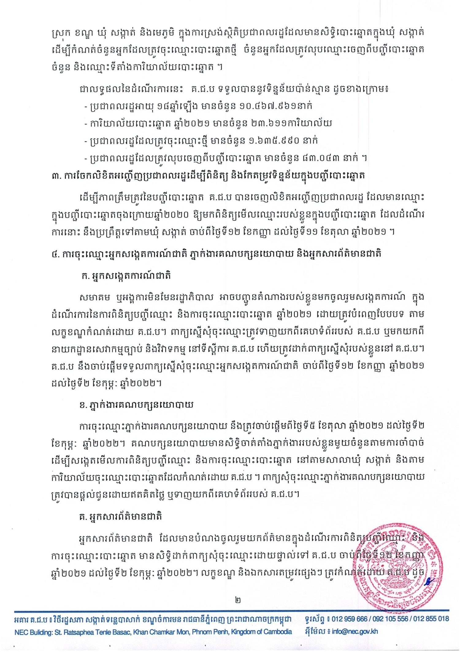 ១. ការប្រកាសផ្សព្វផ្សាយប្រតិទិននៃការពិនិត្យបញ្ជីឈ្មោះ និងការចុះឈ្មោះបោះឆ្នោត ឆ្នាំ២០២១