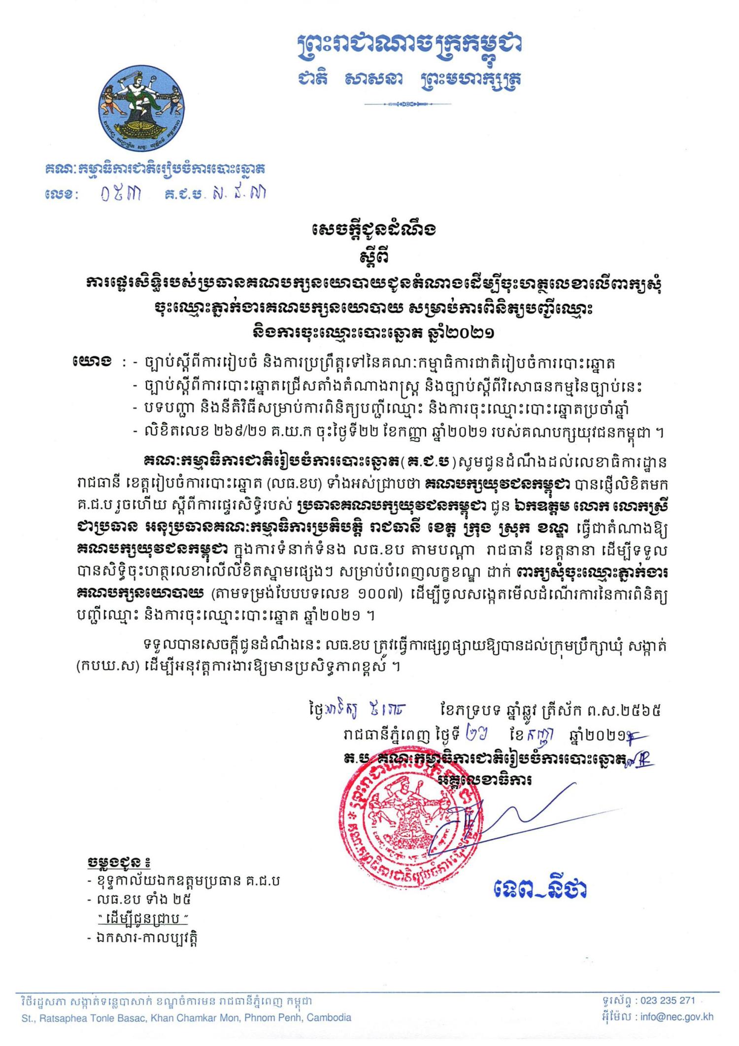 សេចក្ដីជូនដំណឹង លេខ ០៥៣ ស្ដីពីការផ្ទេរសិទ្ធិរបស់ប្រធានគណបក្សយុវជនកម្ពុជា ជូនតំណាងដើម្បីចុះហត្ថលេខាលើពាក្យសុំចុះឈ្មោះភ្នាក់ងារគណបក្សនយោបាយ សម្រាប់ការពិនិត្យបញ្ជីឈ្មោះ និងការចុះឈ្មោះបោះឆ្នោត ឆ្នាំ២០២១