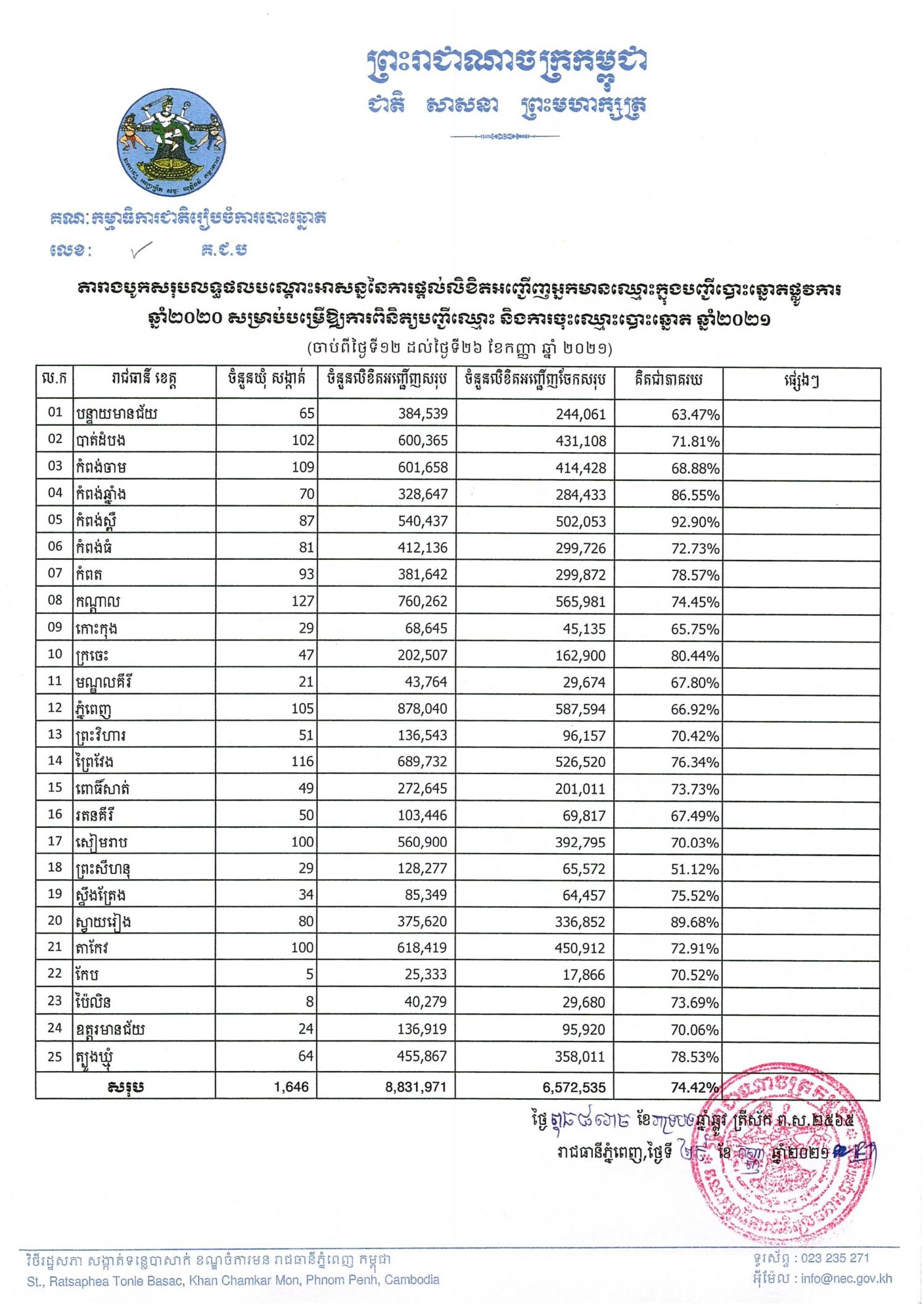 តារាងបូកសរុបលទ្ធផលបណ្ដោះអាសន្ននៃការផ្ដល់លិខិតអញ្ជើញអ្នកមានឈ្មោះក្នុងបញ្ជីបោះឆ្នោតផ្លូវការ ឆ្នាំ២០២០ សម្រាប់បម្រើឱ្យការពិនិត្យបញ្ជីឈ្មោះ និងការចុះឈ្មោះបោះឆ្នោត ឆ្នាំ២០២១ គិតចាប់ថ្ងៃទី១២ ដល់ថ្ងៃទី២៦ ខែកញ្ញា ឆ្នាំ២០២១