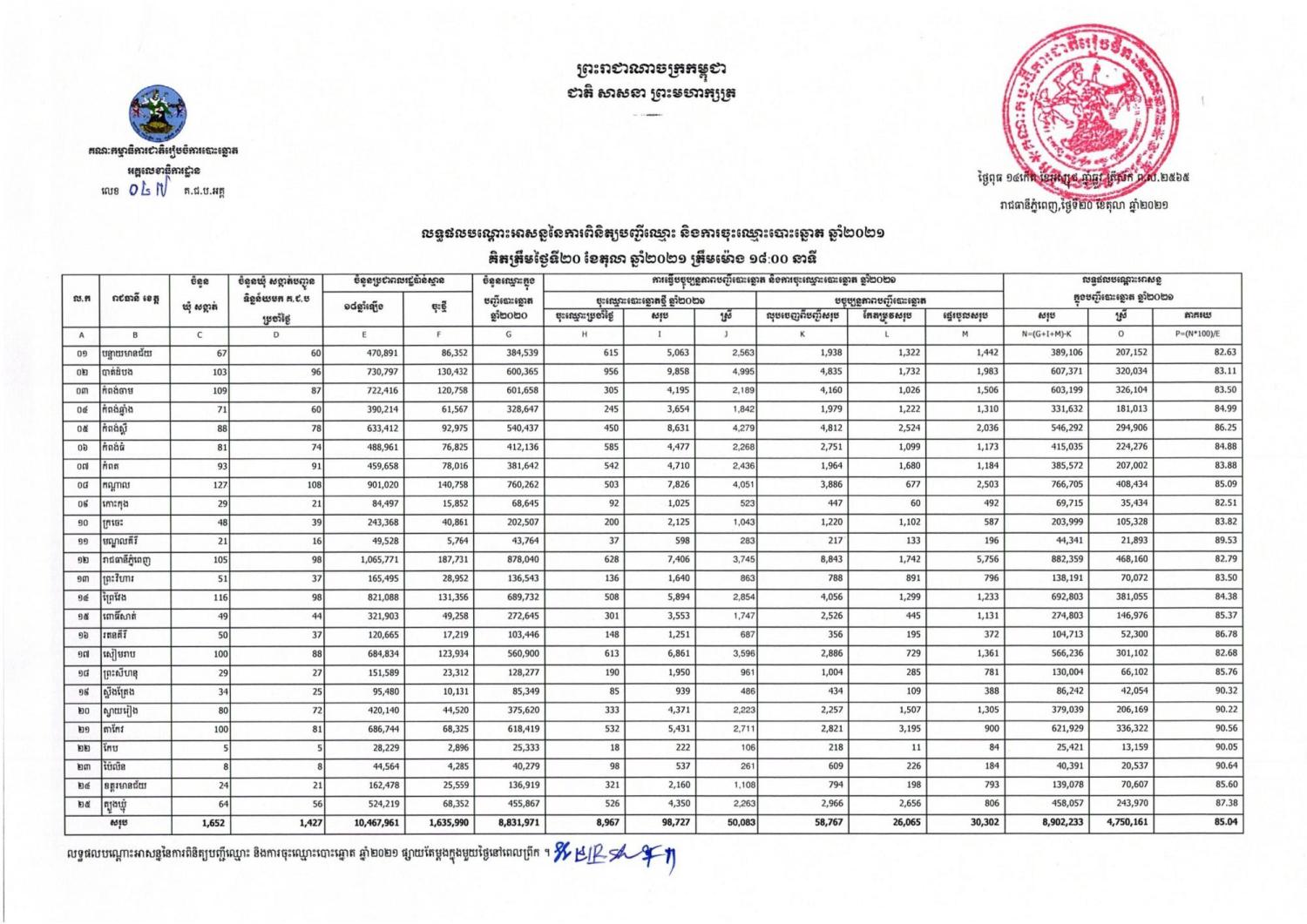 លទ្ធផលបណ្ដោះអាសន្ននៃការពិនិត្យបញ្ជីឈ្មោះ និងការចុះឈ្មោះបោះឆ្នោត ឆ្នាំ២០២១ គិតត្រឹមថ្ងៃទី២០ ខែតុលា ឆ្នាំ២០២១ ត្រឹមម៉ោង ១៨:០០ នាទី