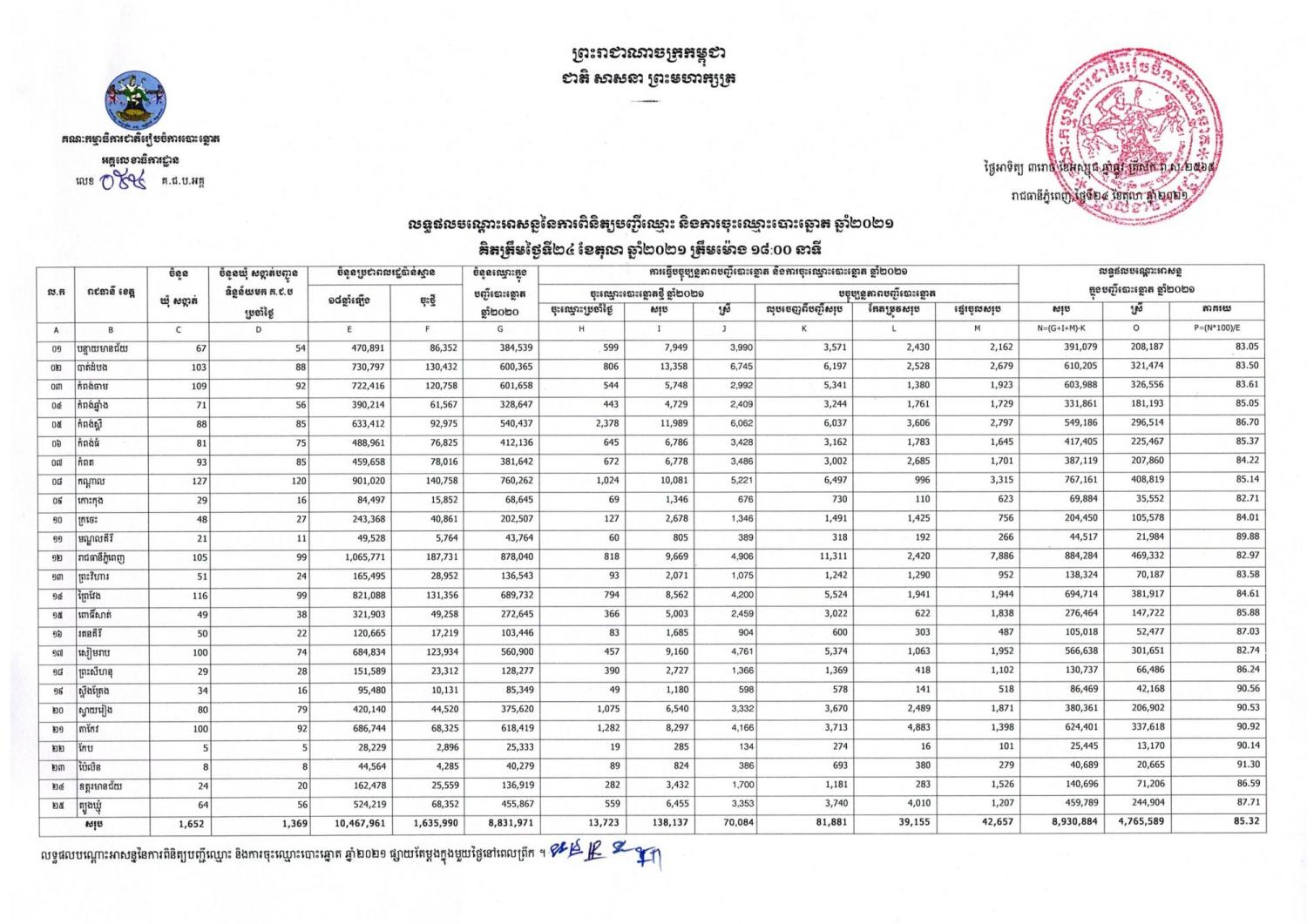 លទ្ធផលបណ្ដោះអាសន្ននៃការពិនិត្យបញ្ជីឈ្មោះ និងការចុះឈ្មោះបោះឆ្នោត ឆ្នាំ២០២១ គិតត្រឹមថ្ងៃទី២៤ ខែតុលា ឆ្នាំ២០២១ ត្រឹមម៉ោង ១៨:០០ នាទី