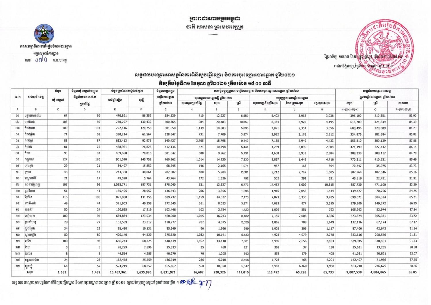 លទ្ធផលបណ្ដោះអាសន្ននៃការពិនិត្យបញ្ជីឈ្មោះ និងការចុះឈ្មោះបោះឆ្នោត ឆ្នាំ២០២១ គិតត្រឹមថ្ងៃទី៣១ ខែតុលា ឆ្នាំ២០២១ ត្រឹមម៉ោង ១៨:០០ នាទី