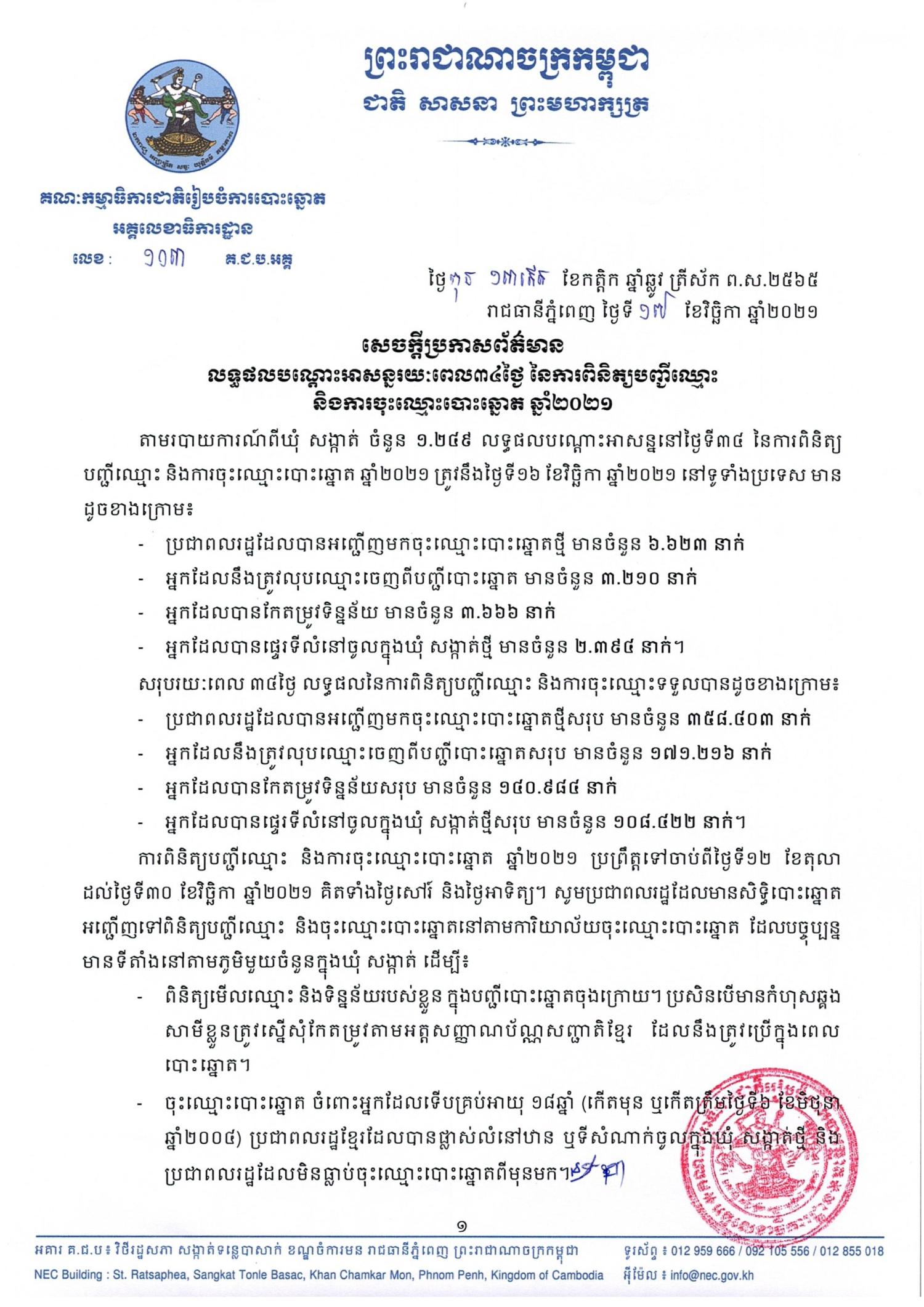 តាមរបាយការណ៍ពីឃុំ សង្កាត់ ចំនួន ១.២៤៩ លទ្ធផលបណ្ដោះអាសន្ននៅថ្ងៃទី៣៤ នៃការពិនិត្យបញ្ជីឈ្មោះ និងការចុះឈ្មោះបោះឆ្នោត ឆ្នាំ២០២១ ត្រូវនឹងថ្ងៃទី១៦ ខែវិច្ឆិកា ឆ្នាំ២០២១ នៅទូទាំងប្រទេស មានដូចខាងក្រោម៖