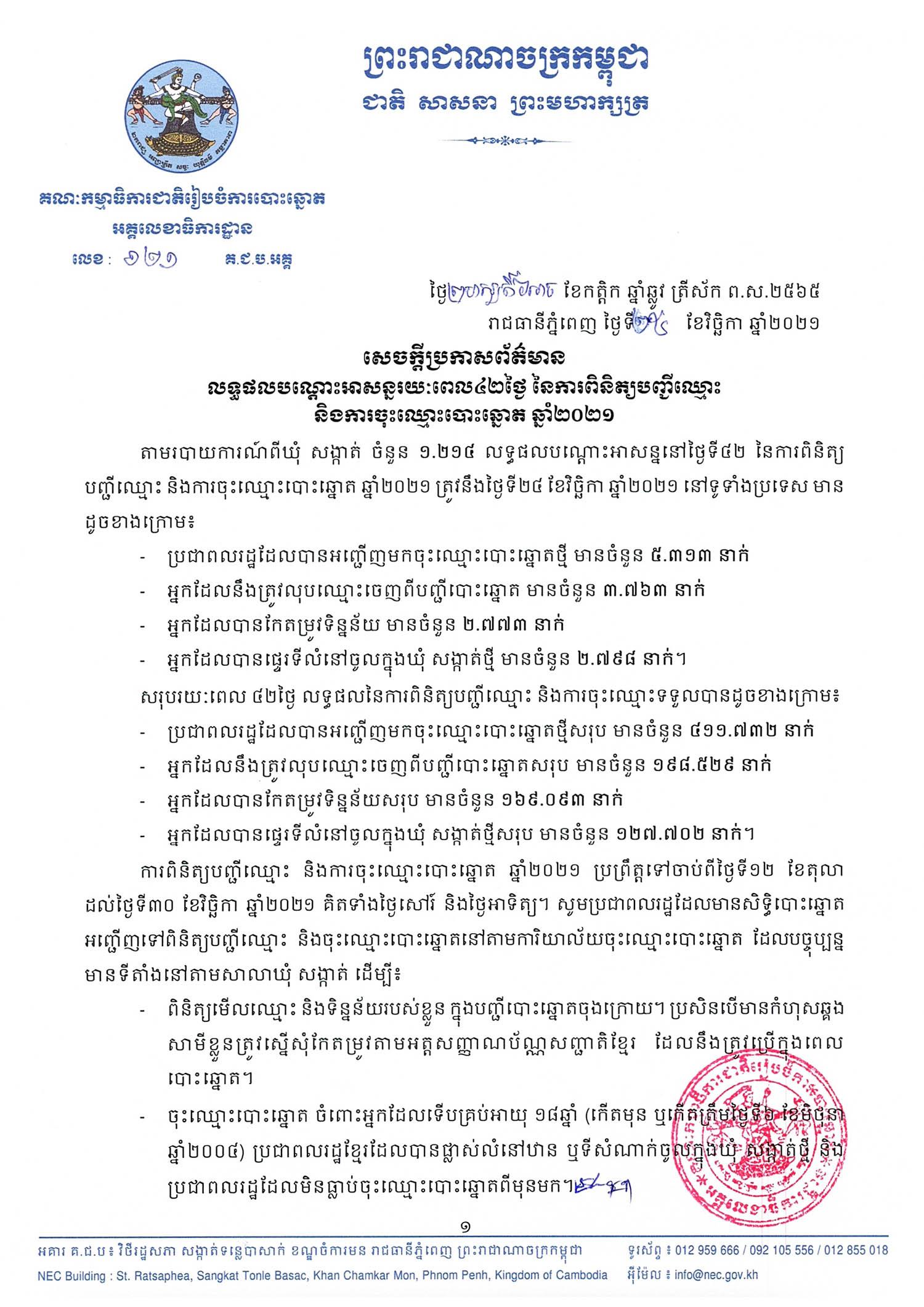 តាមរបាយការណ៍ពីឃុំ សង្កាត់ ចំនួន ១.២១៤ លទ្ធផលបណ្ដោះអាសន្ននៅថ្ងៃទី៤២ នៃការពិនិត្យបញ្ជីឈ្មោះ និងការចុះឈ្មោះបោះឆ្នោត ឆ្នាំ២០២១ ត្រូវនឹងថ្ងៃទី២៤ ខែវិច្ឆិកា ឆ្នាំ២០២១ នៅទូទាំងប្រទេស មានដូចខាងក្រោម៖