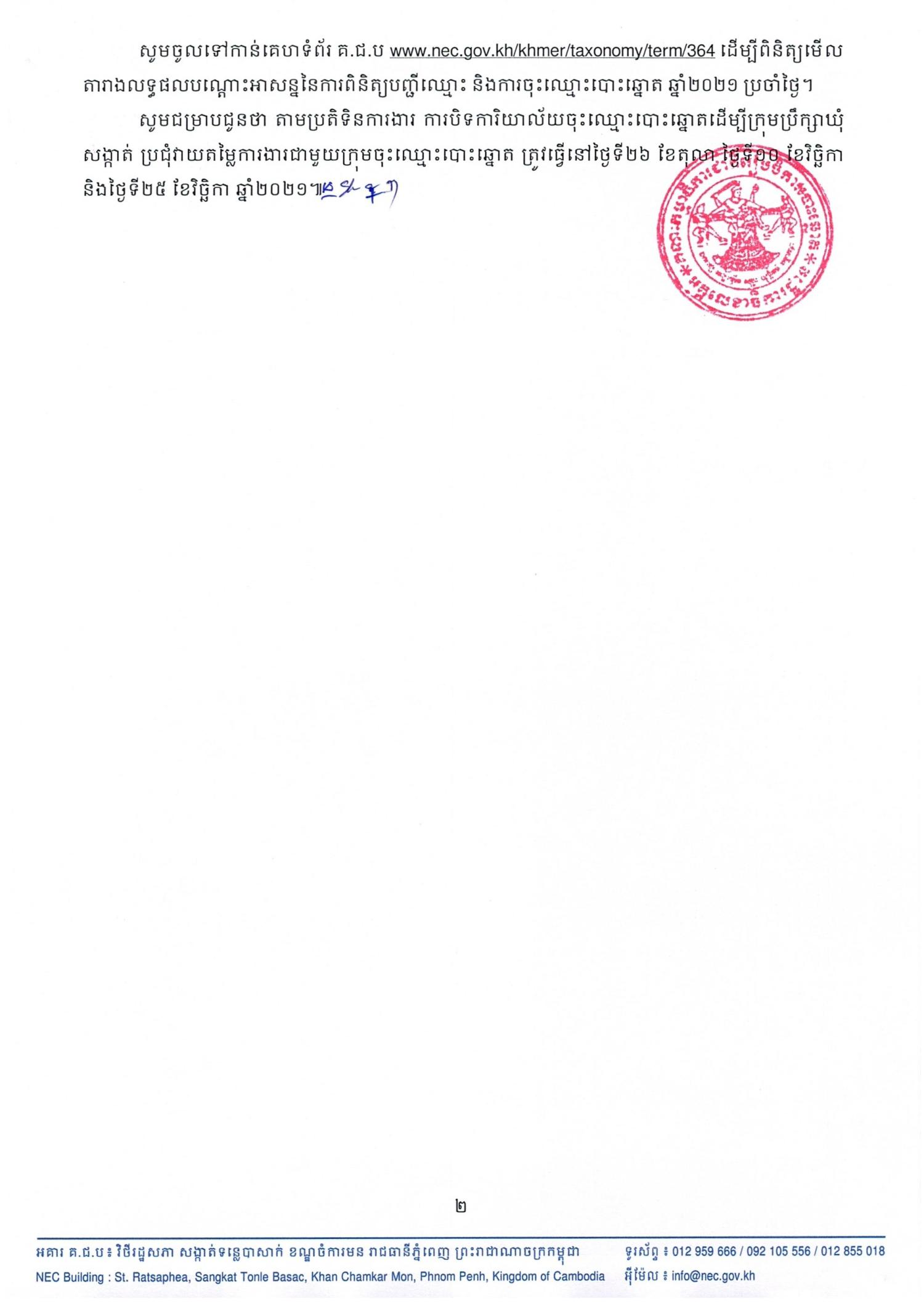 ការពិនិត្យបញ្ជីឈ្មោះ និងការចុះឈ្មោះបោះឆ្នោត ឆ្នាំ២០២១ ប្រព្រឹត្តទៅចាប់ពីថ្ងៃទី១២ ខែតុលា ដល់ថ្ងៃទី៣០ ខែវិច្ឆិកា ឆ្នាំ២០២១ គិតទាំងថ្ងៃសៅរ៍ និងថ្ងៃអាទិត្យ។ សូមប្រជាពលរដ្ឋដែលមានសិទ្ធិបោះឆ្នោត អញ្ជើញទៅពិនិត្យបញ្ជីឈ្មោះ និងចុះឈ្មោះបោះឆ្នោត នៅតាមការិយាល័យចុះឈ្មោះបោះឆ្នោត ដែលបច្ចុប្បន្នមានទីតាំងនៅតាមសាលាឃុំ សង្កាត់ ដើម្បី៖