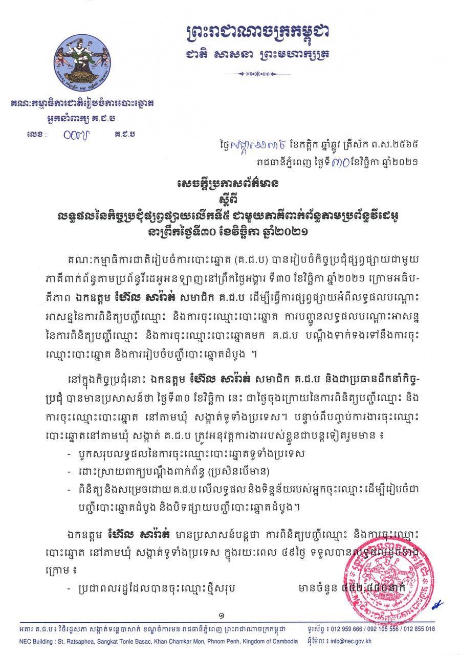 គណៈកម្មាធិការជាតិរៀបចំការបោះឆ្នោត (គ.ជ.ប) បានរៀបចំកិច្ចប្រជុំផ្សព្វផ្សាយជាមួយ ភាគីពាក់ព័ន្ធតាមប្រព័ន្ធវីដេអូអនឡាញនៅព្រឹកថ្ងៃអង្គារ ទី៣០ ខែវិច្ឆិកា ឆ្នាំ២០២១ ក្រោមអធិប-តីភាព ឯកឧត្តម ហ៊ែល សារ៉ាត់ សមាជិក គ.ជ.ប ដើម្បីធ្វើការផ្សព្វផ្សាយអំពីលទ្ធផលបណ្តោះអាសន្ននៃការពិនិត្យបញ្ជីឈ្មោះ និងការចុះឈ្មោះបោះឆ្នោត ការបញ្ជូនលទ្ធផលបណ្តោះអាសន្ននៃការពិនិត្យបញ្ជីឈ្មោះ និងការចុះឈ្មោះបោះឆ្នោតមក គ.ជ.ប បណ្តឹងទាក់ទងទៅនឹងការចុះឈ្មោះបោះឆ្នោត និងការរៀបចំបញ្ជីបោះឆ្នោតដំបូង ។