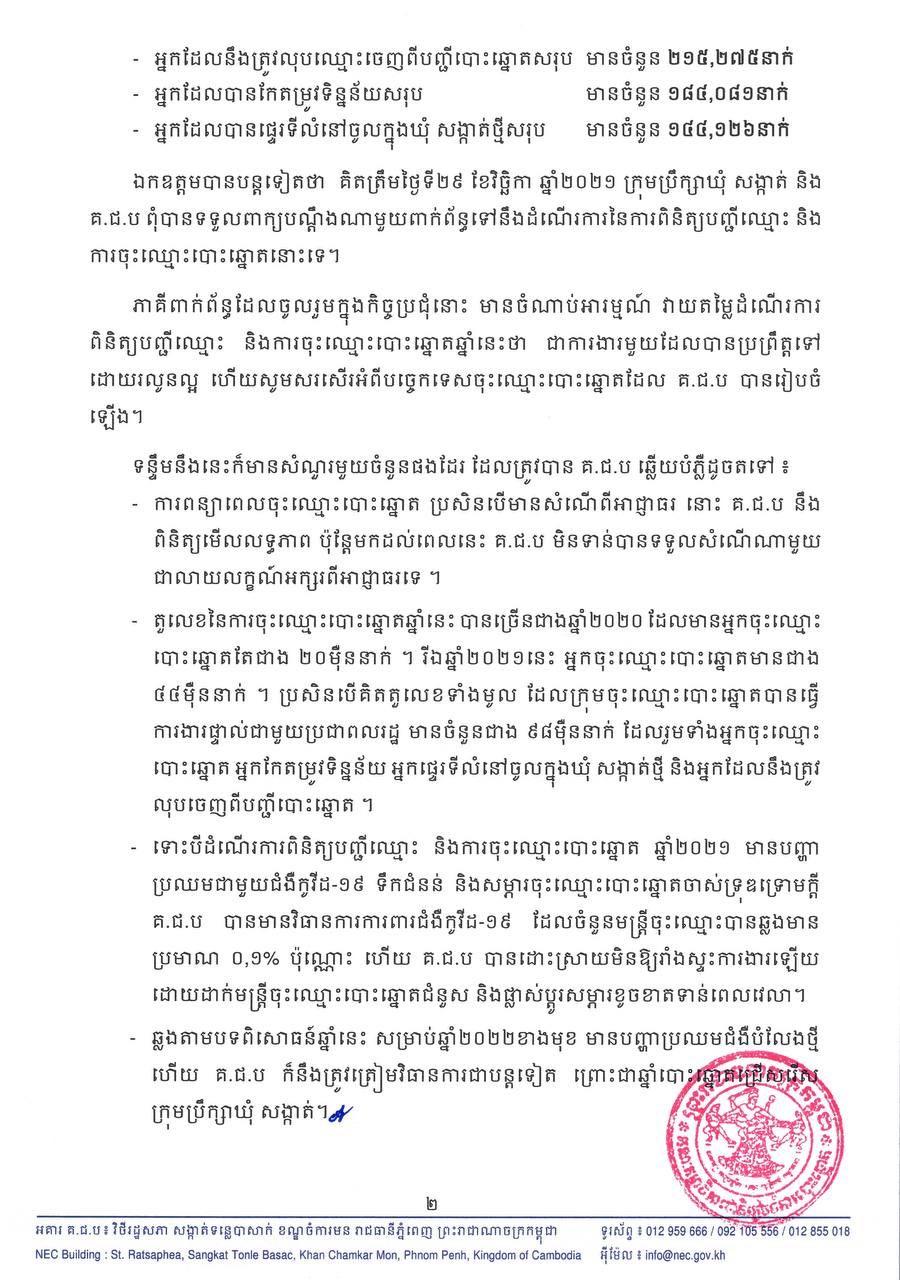 - ទោះបីដំណើរការពិនិត្យបញ្ជីឈ្មោះ និងការចុះឈ្មោះបោះឆ្នោត ឆ្នាំ២០២១ មានបញ្ហា ប្រឈមជាមួយជំងឺកូវីដ-១៩ ទឹកជំនន់ និងសម្ភារចុះឈ្មោះបោះឆ្នោតចាស់ទ្រុឌទ្រោមក្តី គ.ជ.ប បានមានវិធានការការពារជំងឺកូវីដ-១៩ ដែលចំនួនមន្រ្តីចុះឈ្មោះបានឆ្លងមាន ប្រមាណ ០,១% ប៉ុណ្ណោះ ហើយ គ.ជ.ប បានដោះស្រាយមិនឱ្យរាំងស្ទះការងារឡើយ ដោយដាក់មន្រ្តីចុះឈ្មោះបោះឆ្នោតជំនួស និងផ្លាស់ប្តូរសម្ភារខូចខាតទាន់ពេលវេលា។