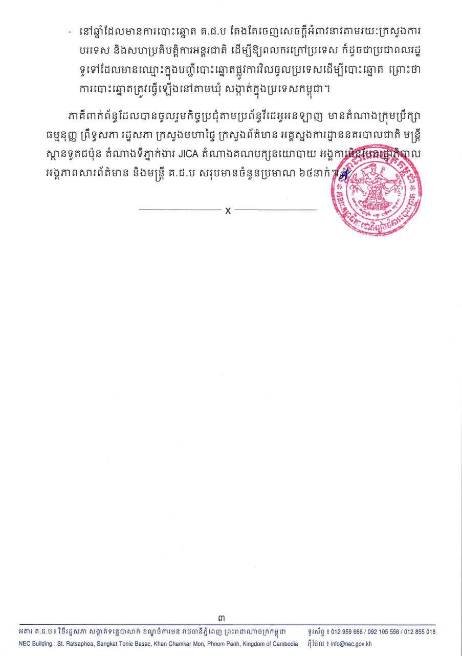 - ការពន្យារពេលចុះឈ្មោះបោះឆ្នោត ប្រសិនបើមានសំណើពីអាជ្ញាធរ នោះ គ.ជ.ប នឹង ពិនិត្យមើលលទ្ធភាព ប៉ុន្តែមកដល់ពេលនេះ គ.ជ.ប មិនទាន់បានទទួលសំណើណាមួយជាលាយលក្ខណ៍អក្សរពីអាជ្ញាធរទេ ។