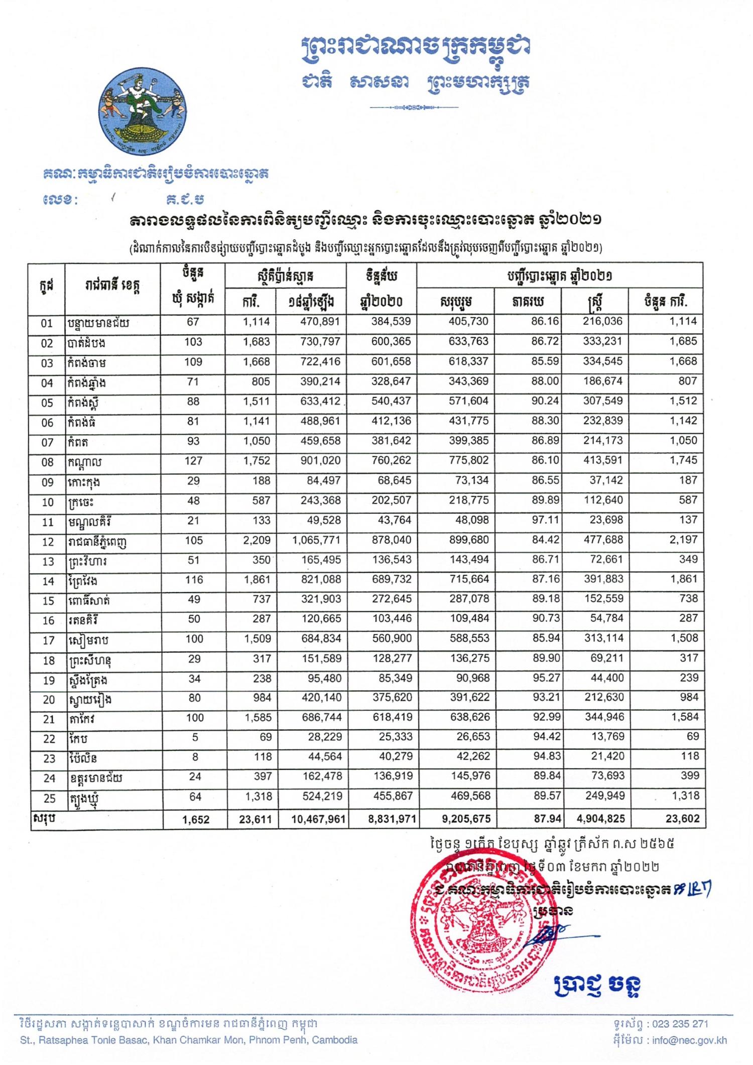 តារាងលទ្ធផលនៃការពិនិត្យបញ្ជីឈ្មោះ និងការចុះឈ្មោះបោះឆ្នោត ឆ្នាំ២០២១ (ដំណាក់កាលនៃការបិទផ្សាយបញ្ជីបោះឆ្នោតដំបូង និងបញ្ជីឈ្មោះអ្នកដែលនឹងត្រូវលុបចេញពីបញ្ជីបោះឆ្នោត ឆ្នាំ២០២១)