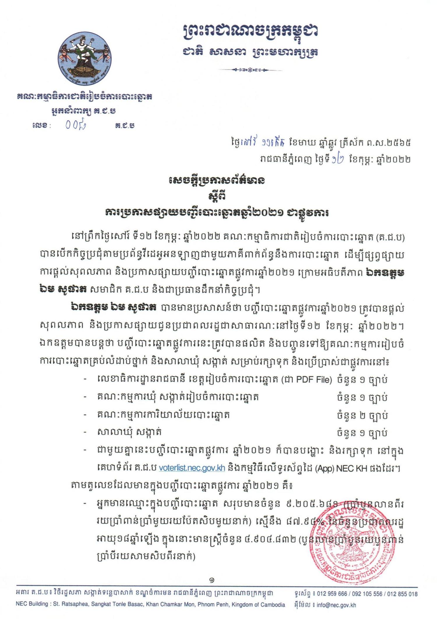 នៅព្រឹកថ្ងៃសៅរ៍ ទី១២ ខែកុម្ភៈ ឆ្នាំ២០២២ គណៈកម្មាធិការជាតិរៀបចំការបោះឆ្នោត (គ.ជ.ប) បានបើកកិច្ចប្រជុំតាមប្រព័ន្ធវីដេអូអនឡាញជាមួយភាគីពាក់ព័ន្ធនឹងការបោះឆ្នោត ដើម្បីផ្សព្វផ្សាយការផ្តល់សុពលភាព និងប្រកាសផ្សាយបញ្ជីបោះឆ្នោតផ្លូវការឆ្នាំ២០២១ ក្រោមអធិបតីភាព ឯកឧត្តម ឯម សូផាត សមាជិក គ.ជ.ប និងជាប្រធានដឹកនាំកិច្ចប្រជុំ។
