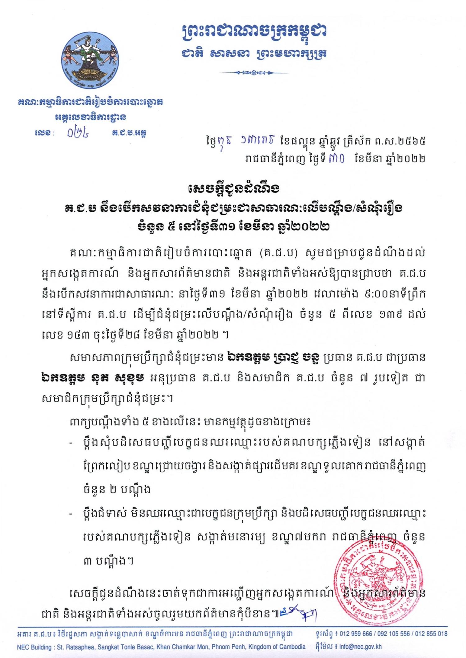 គណៈកម្មាធិការជាតិរៀបចំការបោះឆ្នោត (គ.ជ.ប) សូមជម្រាបជូនដំណឹងដល់អ្នកសង្កេតការណ៍ និងអ្នកសារព័ត៌មានជាតិ និងអន្តរជាតិទាំងអស់ឱ្យបានជ្រាបថា គ.ជ.ប នឹងបើកសវនាការជាសាធារណៈ នាថ្ងៃទី៣១ ខែមីនា ឆ្នាំ២០២២ វេលាម៉ោង ៩:០០នាទីព្រឹក នៅទីស្ដីការ គ.ជ.ប ដើម្បីជំនុំជម្រះលើបណ្ដឹង/សំណុំរឿង ចំនួន ៥ ពីលេខ ១៣៩ ដល់លេខ ១៤៣ ចុះថ្ងៃទី២៨ ខែមីនា ឆ្នាំ២០២២ ។