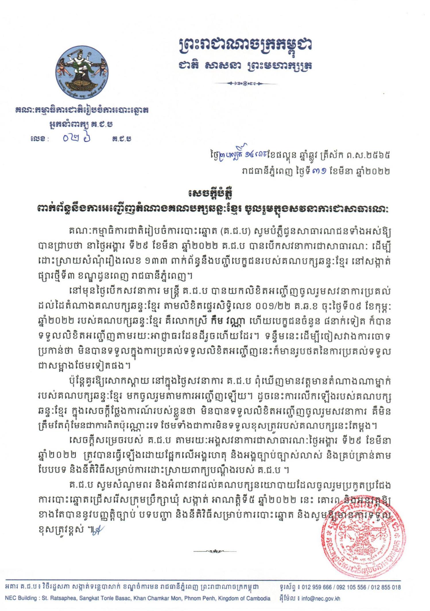គណៈកម្មាធិការជាតិរៀបចំការបោះឆ្នោត (គ.ជ.ប) សូមបំភ្លឺជូនសាធារណជនទាំងអស់ឱ្យបានជ្រាបថា នាថ្ងៃអង្គារ ទី២៩ ខែមីនា ឆ្នាំ២០២២ គ.ជ.ប បានបើកសវនាការជាសាធារណៈ ដើម្បីដោះស្រាយសំណុំរឿងលេខ ១៣៣ ពាក់ព័ន្ធនឹងបញ្ជីបេក្ខជនរបស់គណបក្សឆន្ទៈខ្មែរ នៅសង្កាត់ផ្សារថ្មីទី៣ ខណ្ឌដូនពេញ រាជធានីភ្នំពេញ។
