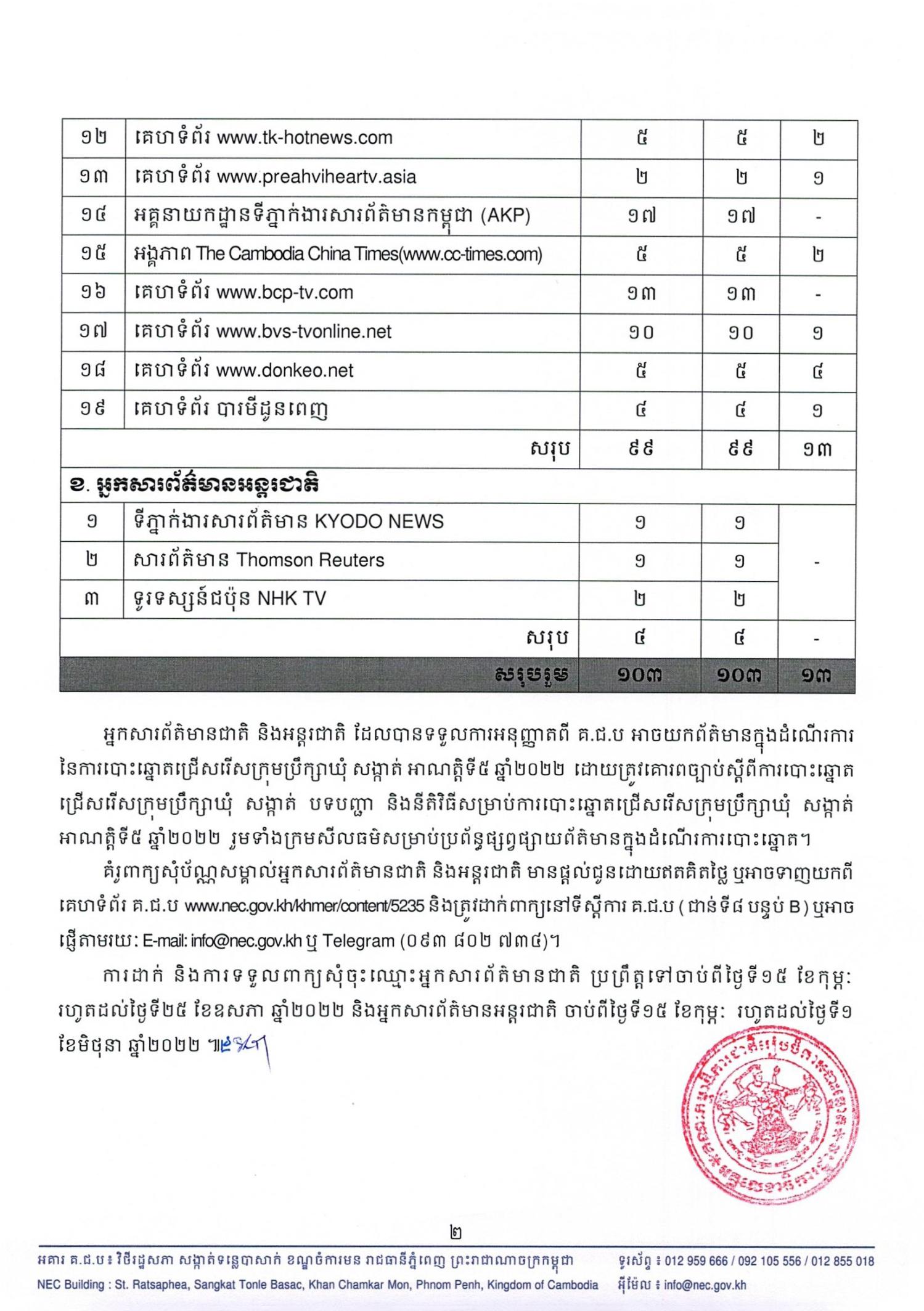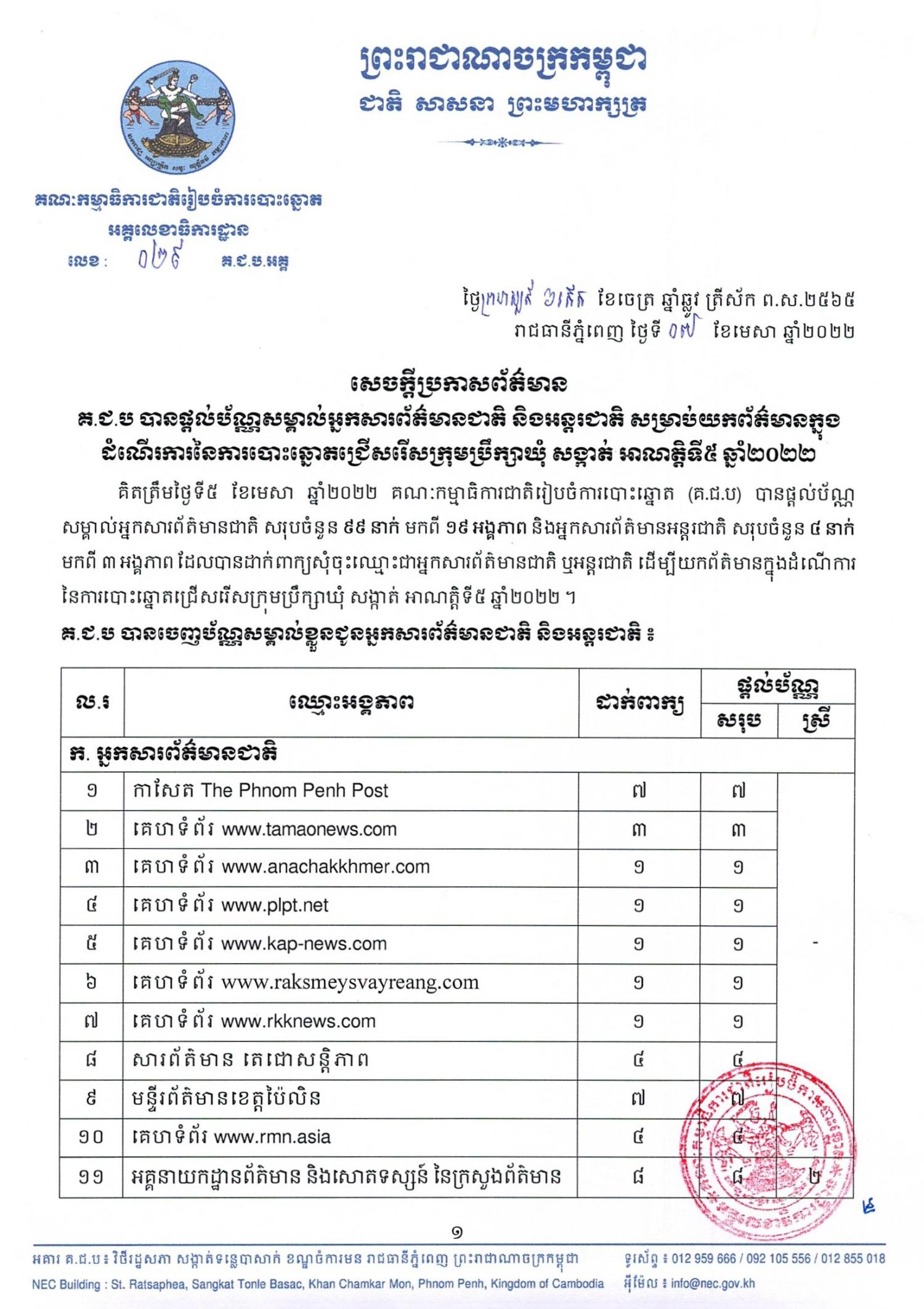 សេចក្តីប្រកាសព័ត៌មាន លេខ ០២៩ គ.ជ.ប.អគ្គ៖ គ.ជ.ប បានផ្ដល់ប័ណ្ណសម្គាល់អ្នកសារព័ត៌មានជាតិ និងអន្តរជាតិ សម្រាប់យកព័ត៌មានក្នុងដំណើរការនៃការបោះឆ្នោតជ្រើសរើសក្រុមប្រឹក្សាឃុំ សង្កាត់ អាណត្តិទី៥ ឆ្នាំ២០២២